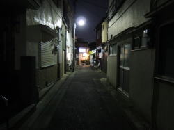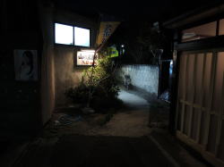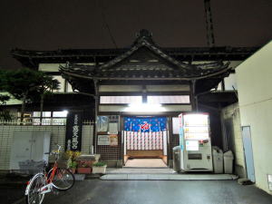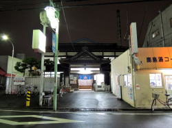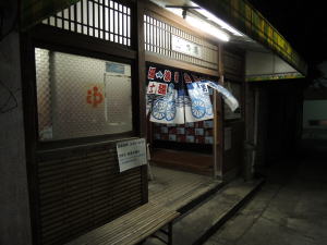 しとしと肩を濡らす春の雨、傘も持たずに要町。どこをどう進んだのだろう。湿った夜道をぐねぐねとさまようこと10分、15分…説明は無理だ。 自力での到達も無理と判断し、そのへんの店のおばちゃんに聞いたら、「そこを左に曲がって次を右に曲がったら見えてくる」との教え。 あの奥か? ![]() (左)看板らしきものが (右)おぉ! 一見、突き当りのようだが、矢印のごとく道が右にずれて続いている。この先はさらに細くなる。 そこへ進むや、忽然と風呂屋の玄関が口を開けていた。 ![]() ゾクッ、と音を立てて、首筋の後ろのあたりが時空のゆがみを感知する。 このまま入ってしまうのも惜しくて、いったん路地を通り抜ける。 ![]() (左)通り過ぎて振り返る (右)反対側に出ると、銭湯の全体像が闇夜に浮かび上がる 喉元までこみ上げたこの興奮、どう沈めればいいのか。 落ち着け俺。とにかく風呂だ。 下足スペースも味わい深い中へ入ると、おぉ、東京の伝統銭湯だ。格天井ではないけど、高々と伸びるタテ長空間が心地よい。。 前庭に濡れ縁、木枠の掃き出し引き戸。これですね。 壁にオリジナルの山の湯ポスターが貼ってある。絵の好きな常連客か地元の学生が描いたものだろうか、愛されている証拠やな。 雨に濡れたので早く湯に浸かりたい。 浴室へ入るや、ど真ん中の大きなダルマ型湯船にニコニコ顔で迎えられる。東京にもこんなのがあるとは! しかもピカピカや。内側フチの何ヶ所かからジェットが出ている。 正面には優美な丸山師の富士山ペンキ絵、男女壁には湖水のタイル絵。 左手にはスチームサウナ室があるが、中は懐かしい草の香が充満している。よく見ると壁に乾燥よもぎが吊るされているではないか。 カラン類も快調、隅々まで清潔。ウーム・・・アプローチから風呂設備まで、どこまでいっても唸らされる。 長風呂を堪能して上がり、服を着ながらフト見ると、複雑な動きをするマッサージ器や馬乗りマシーンが脱衣場の一角に置かれている。・・・エ? これ全部無料で使い放題やと!? もはや興奮は増すばかり。 当然のことながら、長風呂から上がってからも長くなった。 この日、俺は山形から在来線を乗り継いでの東京入り、しかも雨に濡れて、正直くたびれていた。 山の湯はそれらを完膚なきまでにほぐし切ってくれた。 東京の風呂代は関西に比べて高いけど、完全に取り返してお釣りが来た。 なのに、そんな素敵な銭湯へ行く道が説明できない迷路状態とは! 東京おそるべし! (2014.4.10) |