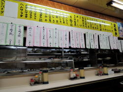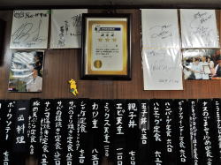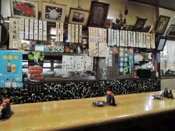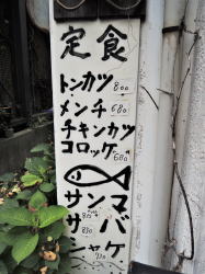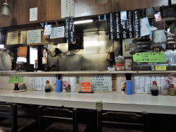 中央線の中野駅から500mくらい歩いた道路沿いに、長年変わらぬ姿でたたずむ1軒の食堂あり。 ![]() (左)左隣にはピカピカビル (右)これはやられるでしょう 中に入ると、カウンターとテーブル3つほどの小さな店。おやじさんが一人でやってるようだ。 メニューは壁にズラズラズラ~っと黒札白文字で並んでいる。種類豊富で値段も食堂リーズナブル価格。でも麺類はなさげ。 ほかにも色紙やら写真やら、クマのプーさんやら折り紙やらいろいろ貼ってある。それを見ていたらおやじさんが、「あの賞状見てよ。とんねるずのキタナシュランに出たんだよ」とおっしゃる。 ![]() (左)カウンター (右)メニューと色紙と賞状 俺はテレビを見ないのでその番組は見たことないが、なんかそういうのがあるというのは知っている。「キタナイ」のにうまい、という店は確かにあるし、わが激渋食堂の中にもそういった店のいくつかは含まれている。 が、俺としては「キタナイ」という点での線引き、ジャンル分けには興味がない。なんとなくガサツなバラエティ番組の上から目線を感じてしまうしね~。 といいつつ写真だけ撮らせてもらう。俺はこの店がとくにキタナイとは思わないが、人柄のよいおやじさんはそれに選ばれて喜んでおられるので、ご本人が楽しければすべてOK、ニコニコだ。 んでまたハムエッグ定食630円。東京の食堂には必ずこれがあるのでつい注文してしまう。ごはんも味噌汁もうまい。(2016年7月) ハムエッグ定食630円 |