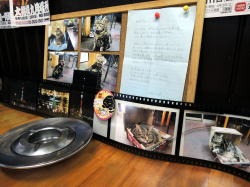 雨のそぼ降る泪橋からドヤ街をぐねぐねっと抜けていくと、角に渋い店がある。1階暖簾まわりのたたずまいもいいが、2階部分の外壁に取り付けられている3つの看板がじつによい。 豚(たぶん)の絵がよい中に入ると、相当年季の入った小空間にテーブル3つほど。他に客はおらず。散在する丸イスが沈滞ムードを盛り立てる。 床のストーブ前には段ボール箱が落ちている。いや、落ちているのではなく、中で猫が寝ていた。ストーブかぶりつきの猫御殿なのだった。 ![]() (左)店内 (右)中央に陣取る猫御殿 ![]() (左)火事で焦げたかのようなメニュー (右)オリジナル湯のみが渋い 壁に貼られているメニューの黒ずみっぷりには、なにか意地のようなものを感じてしまう。カレーライス(650円)類とラーメン(500円)類、丼物700円~、その他洋食ライスもの。 チキンライスの横に「野菜イタメライス」や「オムレツライス」などが書かれているが、まさか野菜とライスのまぜ炒めみたいなんとちゃうわな? 地味な感じのおやじが一人でやっているようだ。カツカレー850円を注文した。 ![]() (左)カツカレー (右)お客さんからのお手紙 壁に、若い女性と思われるお客さんからの手紙が貼られている。猫好きなのだろう、この店で過ごした猫との思い出写真も一緒に何枚か貼られている。 やがておやじがカツカレーを持ってきた。カツの肉が厚いやん、嬉しいではないか。カレーは普通の日本カレーで、昔から食べ慣れたような安定の味だ。 肌寒い日だったが、ストーブの効いた部屋で猫の寝姿を見ながらカレーを食って、たいそう温もった。 場末の小さな古びた食堂から、汗をかきかきまた外へ出てゆく。そんな旅のヒトコマであった。 (2015年4月) |