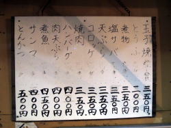 大塚駅から5分くらい歩いたところ。2つのビルに挟まれながら暖簾を揺らす健気な姿は、まさしく、“ちいさいおうち”以外の何物でもない。 ![]() (左)がんばれ、負けるな! (右)湯気にけぶる店内とメニュー 中に入ると、年季が入りつつもきれいに整えられた店内。手前にテーブル4つほどと、奥に小上がり座敷4卓あり、狭い店の半分ほどを座敷が占める。 居心地のよさ抜群おばあさんとおじいさんがやっておられる店。お二人ともにこやかで注文を頼みやすく、すこぶる感じよい。 小あがりの壁上部には食品衛生関係のいろんな賞状が飾られている。 ![]() (左)この日の一品もの (右)あぁ、こういう店で鍋もええなあ メニューは定食が500円台から20種類くらい、丼物からオムライスなど洋食もの、ラーメン480円などのほか、一品ものがいろいろ。かなり種類が多いが、そば・うどん類はない。 この日は10年以上ぶりの知人とここで待ち合わせ。小上がりに陣取って、ビール大瓶550円や酒(沢の鶴)400円を飲みながら、一品ものを次々に作ってもらう。 ![]() (左)なすしょうが炒め300円 (右)さしみ600円? ![]() (左)なんかの天ぷら (右)タラコとオムレツ?忘れた ![]() (左)コロッケ (右)つけもの どれもうまい。だんだんと値段もわからなくなり、メニューから選ぶというよりは食べたいものを作ってもらう感じになってきたぞ。 客層はいろいろだ。若い女性が小あがりの隅の席で一人で晩飯を食っている。その女性が帰ったら、また別の若い女性が同じ席に座って一人めしを食いはじめ、閉店過ぎて10時ごろまでいたのが印象的だった。 我々もうっかり10:15くらいまでいたが、お店のご夫婦は嫌な顔ひとつせず、愛想よくて嬉しくなった。お勘定は、あれこれ食って生ビール2杯にお銚子4~5本飲んで、2人で4000円台だった。 この店のおかげで、俺の中で東京全体の好感度が上がってしまったではないか。 (2015年4月) |