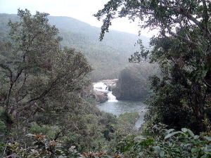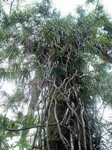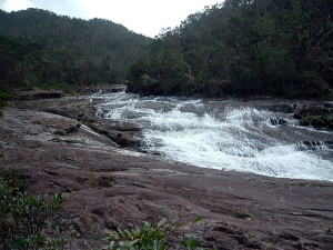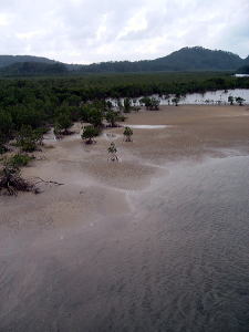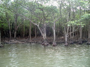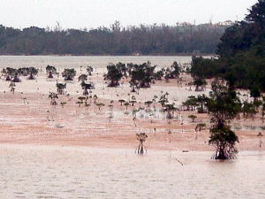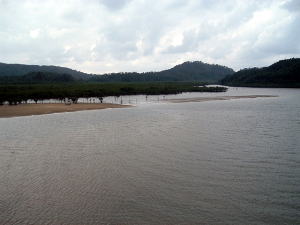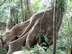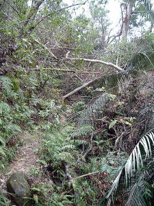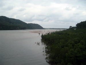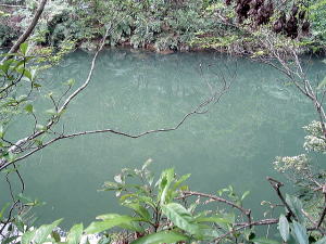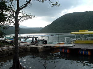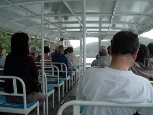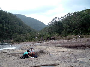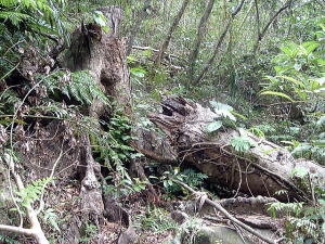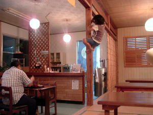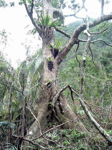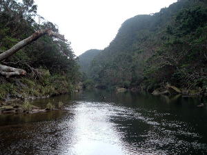 2〜3日目◆西表島:水上ロデオの原始島 八重山最大の島・西表へ行く航路は、東部の大原行きと、西部の上原行きの二つがある。名前が似ているのでややこしい。 西表島の大部分は未開のジャングルだが、その真ん中を徒歩で抜ける縦断コースがあるらしいので、それを西の上原から東の大原へ踏破してやろうという計画だ。 上原行きの便は今朝は欠航になっていたけど、2時40分のは無事に出航した。上原まで50分。竹富島でオリオンを飲み、石垣島に戻ってもオリオン飲んだせいか、なんか眠い。ちょっと寝ようかな。 船内はガラ空き。デッキ席にも魅かれたが、とりあえず寝るために船室に入った。 3人掛けに横になって寝ようとしたが、出航してしばらくすると、体が宙に浮いた。その直後、座席にドーンと叩きつけられる。次の瞬間また体が宙に浮き、ドーンと叩きつけられる。とても寝ていられない。 起き上がってみると、船は次々に迫り来る大波に船首から乗り上げては、波の谷間に墜落して行くことを繰り返している。そのたびに「ザバッシャーッ!」とものすごい音がする。窓の外は波しぶき一色で何も見えない。 まともに座っていることもできず、前の座席の背中にある手すりを両手でつかみ、半立ち状態で膝のクッションを使いながら、ロデオのように波乗りをし続ける。そうしないと間違いなく吐いてしまう。妊娠してる人は確実に流産だろう。 前の席にいる姉を見ると、全身を激しく上下動させながらゲラゲラ笑っている。狂ったらしい。 操縦士は波の隙間を突いて進むべく必死で舵を高速回転させているが、気休め程度の効果しかない。 そういや、デッキ席にも数人座っていたようだが、あの人たちはいったいどうなっているのだろうか。ただで済むとは思われないが・・・。 耐えること50分。ようやく上原港に着いた。 デッキに出ると、そこにいた数人の無残な姿が目に飛び込んできた。 新婚旅行だろうか、大きなトランクをひいた若いカップルが全身ズブ濡れでヨロヨロと船から下りていく。おそらく50分間、海水を頭からバケツ5000杯分くらいは浴びせかけられたに違いない。かわいそうに女の人は長い髪を顔面や服に貼り付かせ、全身から塩水をしたたらせて、溺死寸前で救助された人のような姿になっている。自分の身に起きた出来事が未だに信じられないような、うつろな目つきだ。背中に貼りついたワンピースが透け、ブラやパンティーの線が露わになっているのが痛々しい。 デッキの人数が一人減っていても不思議はない揺れだった。この船会社の人は、こうなることがわかってたはずだろう? なのに一言の注意もなしとはね。そして着いたあとも、ズブ濡れの人たちを当たり前のように船から送り出している・・・まったくもって信じ難い。 本土の船でこれをやったら恐らく裁判沙汰だろう。 でも、ここはイリオモテ。これがイリオモテなのだと思うほかない。イリオモテ・・・恐るべし・・・。 ともあれ西表島に着いた。大きな島だが人口は少なく、小さな竹富島を中心とする竹富町に所属している。上原にも人家がポツポツあるだけで、店はスーパー1軒のみ。 そのスーパーの向かいにある民宿カンピラ荘にチェックイン。素泊まり3150円(共同シャワー)。 西表に来たのはいいが、午後4時、中途半端な時間だ。 近くの星砂の浜へでも行こうかと思ったが、バス便が異様に少なく、しかもその最終便にギリギリ乗り遅れてしまった。ははは、もうどこにも行けないや。 仕方なく宿の近所を散歩。牛やヤギが放牧されている。 適当な放牧日が暮れてから、近くの「たまご」という食堂でメシを食い、またオリオン漬けになって、この日は終わった。 * * * * * 翌朝一番のバスで浦内川河口へ向かった。 西表島縦断には役場か森林管理事務所への届出がいるらしい。前日に森林管理事務所に電話してコース状況を聞いたら、秋の台風でかなり荒れているが、なんとか行けるでしょうとのことだった。 縦断コースは、まず浦内(うらうち)川河口から遊覧船で30分ほど川を遡り、中流の軍艦島というところへ行く(河口〜軍艦島は道がない)。そこから歩いて40〜50分ほど川を遡るとカンピレーの滝に至り、その奥から縦断コースが始まるとのこと。カンピレーから東海岸の大原まで、シコシコ歩いて8時間ほどかかるらしい。 で翌朝一番のバスに乗ったわけだが、このバスが上原を出るのがなんと9:28。お、遅すぎるって。通勤通学っちゅうもんは存在せんのかこの島は! 浦内川河口に着いたのが9:45、次の遊覧船の出航は10:00。縦断届けは遊覧船乗り場の窓口で出すようにとのことだったが、窓口で聞いたら案の定、「今から一日で縦断するのはちょっと無理だと思います」。 でしょうね。一日で縦断するには早朝に船をチャーターするか、せめて9:00始発の遊覧船に乗らないと、だとさ。 でもね、朝一番のバスが9:45分なのよね。タクシーは上原に1台のみ、すでに他客が予約済みだったのね。かといって浦