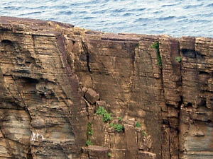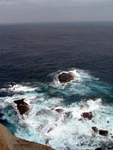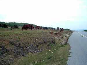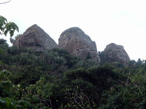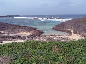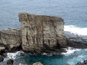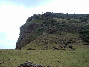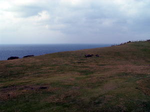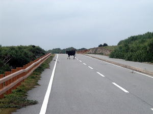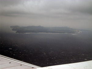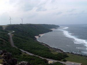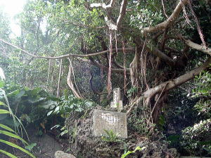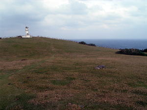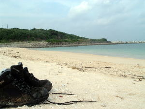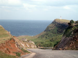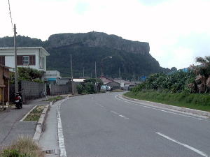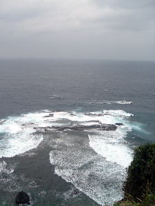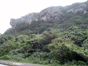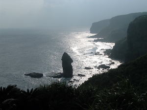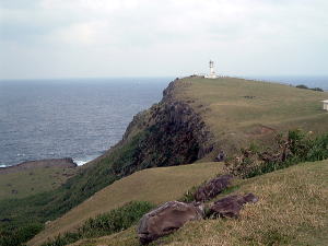 4〜5日目◆与那国島:風の国境にて 西表島の大原港から石垣島の離島桟橋へと戻る。この航路はほとんどサンゴ礁に囲まれた内海を通るためか、さほど揺れなかった。 離島桟橋からそのまま石垣空港へ移動し、10:30の飛行機で与那国島へ。 旅先で飛行機移動なんちゅー贅沢は通常の俺の行動原理からは考えられんのぉ。しかし今行っとかな、与那国に行かずじまいで死んではせっかく俺を産んでくれた天国のカーチャンに申し訳が立たんからね。 ちなみに与那国にはフェリーもあってそのほうが安いのだが、週3〜4便で短期旅行では使いづらい。おまけに通称「ゲロ船」と呼ばれているようで、一般乗客は与那国に着くまで4時間ほどの間ずっと吐き続けるのが普通らしい。 与那国島は別名「どなん」と呼ばれ、これには「渡難」という漢字が当てられている。渡るのに難儀する島という意味だ。 わずか30分のフライトで与那国島が見えてくる。周囲を断崖に囲まれた、絶海の孤島だ。 見えてきたよ与那国が「歓迎いっこく堂」の垂れ幕に迎えられて空港に降り立つ。いや、同じ飛行機にいっこく堂が乗っていたようで。 この島は徒歩で回るにはちょっと広い。レンタサイクルもあるが、起伏が激しくてキツイようだ。時間もないことだし、今回は姉上が借りたレンタカーに便乗だ。 空港前でレンタカーを借りて東の祖納(そない)集落のほうへ車を走らせると、すぐに右手にいかつい断崖が迫ってくる。これだな、観光パンフ類に必ず載っている景勝地、ティンダハナタ。 道路から見えるティンダハナタ車を止めて遊歩道を散策した。ここは16世紀に与那国島を支配した巨漢の女王、サンアイイソバの居城だったそうな。 江戸時代の与那国島は、琉球王朝に支配された。その琉球王朝は薩摩藩に支配され、薩摩藩は江戸幕府に支配されていたわけだから、3重の封建支配を受けていたことになる。3重支配の末端である与那国島の住民は想像を絶する搾取に遭っていたようで、その過酷なエピソードがいろいろ残っている。 サンアイイソバはその過酷な支配に立ち向かった女王(資料では「女酋長」となっている)として敬愛されているようだ。 ティンダハナタは与那国島の岩盤状に堆積したサンゴ土が隆起してできたものだという。岩は手で削れるくらいに軟らかく、水が湧き出ているところもあって生活にも困らない。 しかもここからは与那国島の中心地・祖納集落が一望できる。城としては申し分ない立地だな。 ![]() (左)サンアイイソバの墓 (右)隆起サンゴ土でできた軟らかい岩盤 ![]() (左)ティンダハナタから祖納集落 (右)祖納集落からティンダハナタ さて与那国島といえば世界最大の蛾、ヨナグニサンが住む島だ。ヨナグニサンは密猟などでめったにお目にかかれないらしいが、アヤミハビル館という施設で見られるとのことなので、そこへ向かう。 アヤミハビルとは与那国語でヨナグニサンのこと。しかしこの施設は山の中にあり、しかも案内看板もなくてどこなのかさっぱりわからない。さんざん車で走り回ってやっと到着した。 でも季節的なこともあるのだろうが、あるのは標本のみで、幼虫もマユも実物は見られなかった。ちぇっ。 山から下りて、祖納の東にある浦野墓地群へ。昔は崖に横穴を掘って埋葬していたところらしいが、今は広々とした丘に沖縄独特の大きな亀甲墓がゆったりと点在している。 そのすぐ向かいの浜に下りてみたら、いろんな貝がらがワンサカ落ちている。ここでまりもちゃんのミヤゲに貝がら拾いを1時間。 ![]() (左)浦野墓地群、元は「裏の墓地」だったのでは? (右)貝がらを拾った入江 波の色がなんともいえぬいいかげん腰が痛くなったところで、レンタカーでの島内1周観光に出発。パンフにある名所をなぞっただけだが、この島が石垣や西表よりも厳しい波と風にさらされていることがよくわかった。 島の東端、東崎(アガリサティ)では体ごと飛ばされそうな風が吹き荒れ、海岸には叩きつけるように波が砕け散る。 そこでもまれる景色は厳しく、美しい。高校時代に読んだドーデの『風車小屋だより』に出てくる、コルシカ島のサンギネール灯台のイメージが思い浮かんだ。 ![]() (左)東崎には灯台への道と海岸への道がある (右)アリシ海岸から灯台を見上げる 今度は灯台への道![]() ![]() ものすごい向かい風の中で展開する、最果ての風景 ![]() (左)日本本土の方角から激しく打ち寄せる波 (右)東崎から北海岸と風力発電の眺め すっかり感動して車に戻り、今度は南海岸を西へ。海食崖の台地上をうねうね走る。 宇良部岳の南麓から比川集落に降り、カタブル浜から細長い台地上の南牧場を通り、日本最西端の西崎へ。車ならスイスイ行くが、これは自転車だと相当キツイぞ。 新川鼻付近の海岸台地にヨナグニウマ1頭 ![]() (左)サンニヌ台から軍艦岩、ここも立っているのがやっとのすごい風 (右)そんな岩にも植物が生えている 立神岩と、荒々しい海岸線 ![]() (左)道路は南牧場内を通る。ここは