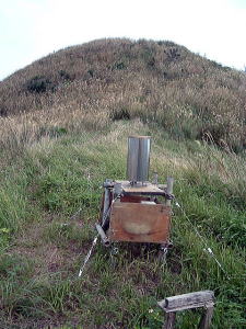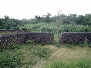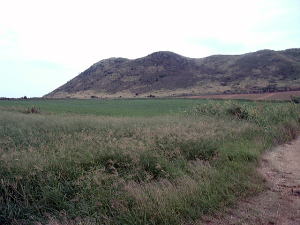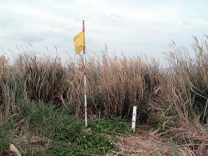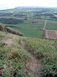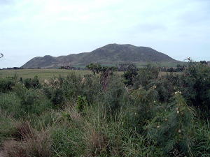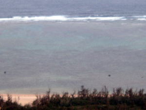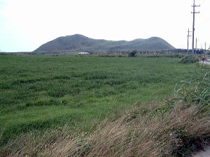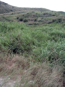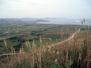 白保は石垣島の南東端にある集落で、石垣市街地からは10kmあまり離れている。カーラ岳はさらに北へ6kmほど離れたところだ。 離島桟橋から東へ走り、空港を超えたあたりに「フルストバル遺跡→」という小さな標識を見つけたので、立ち寄ってみた。 新空港建設推進派の言い分の一つに、「現空港の滑走路延長だとフルストバル遺跡を破壊することになってしまう」というのがあったらしい。 フルストバルは、西暦1500年、琉球王朝と宮古島の2重支配の圧政に苦しむ八重山を解放するために反乱を起こしたオヤケアカハチという人物の居城だったとされる場所だ。 だが道には案内看板の一つもない。台地上の空き地に車をおき、奥の森へ少し歩くと、いきなり建物の土台跡とおぼしき石組みがいくつか現れた。沖縄本島のグスクに少し似ている。 1.7mほどの高さの石垣によじ登り、周囲を眺めてみた。 ![]() (左)楕円形に組まれた石垣 (右)石垣の上から、囲みの入口を見る ![]() (左)石垣の上から東の海を見る (右)台地の東面は20mほどの断崖になっている 台地の東側は断崖になっているが、西側はゆるやかな斜面のまま現在の石垣空港につながっている。 さらに台地の奥へと続く道を歩いていく。観光用の施設は何一つ存在せず、ただ亜熱帯ジャングルの中のあちこちに石組み遺構が無造作に眠っている感じだ。 ふいに轟音が巻き起こって、真上を飛行機が通過していった。 ![]() (左)この真上を飛行機が通った (右)森の中のあちこちに遺跡が点在する フルストバルの丘を下りて、さらに東へ。 小さな谷にも水田が作られ人が住む本州と違って、八重山では集落外にはほとんど人家がない。白保で北に折れて集落から出ると、とたんに広大なペッタンコの牧場地が展開する。 しばらく走ると右前方にカーラ岳とおぼしき姿が見えてきた。東西に細長く伸びた小さな丘だ。木がまったく生えていない。まるで奈良の若草山だ。かつては山全体が牧場だったらしい。 山の北側にトラックの侵入路があり、そこで車から下ろしてもらった。 ![]() (左)北側から見たカーラ岳。左(東)が主峰、右にいくつか小ピークが並ぶ (右)北側のダンプ侵入路から ダンプを何台かやり過ごしながら、カーラ岳の北面に沿ってダンプ道を10分ほど歩くと、主峰と小ピーク群との間くらいのところで、草原を登って行く踏み分けを見つけた。よく見ると草に目印テープもある。 踏み跡は西方向へナナメに続き、そこを登るとわずか数分で稜線に出た。木がないため眺めは最高、丘をわたる風が気持ちいい。 ![]() (左)ここから登る (右)稜線に出たところから主峰を見る 尾根筋には東の主峰へ向けて明確な踏み分けがある。なんとも気分のいい稜線散歩だ。 小ピークと主峰との間に測量計のようなものが設置されている。そこからやや急になりススキの丈が高くなるが、ほどなく頂上に着いた。標高136m。登り口からわずか10分だった。 ![]() (左)測量計と主峰 (右)頂上のポール 頂上からは、もうすぐ失われる世界最大級のサンゴ礁全体が手に取るように見える。ていうか、この頂上自体ももうすぐ失われるわけだが。 しかしまだどこも工事は始まっていない様子だ。 ![]() (左)北の方角。ヌスクマーペーが見える (右)そしてこれが問題の白保のサンゴ礁 サンゴ礁拡大、この距離でも水底まで見える風がひゅうひゅう吹く中に突っ立って景色をぼんやり10分ほど眺めたのち、来た道を戻る。測量計のところから南側の白保方面へ下りる道があったので、そこを下ってみた。 下山路から南方面。中央の遠端に白保集落があるこの下りは斜面をまっすぐ下りるのでかなり急坂だ。トトトトっと下りると、区画されてはいるが何にも利用されていない草地が広がり、まっすぐ南へ道が伸びている。 それを進むと、ゴルフ場外縁の並木に突き当たった。振り返るとカーラ岳の雄姿がゆったりと横たわる。ちっぽけな低い丘だが、周囲がまったくの平野なので意外に雄大な風景で見応えがあり、しみじみと眺めてしまった。 これを削ってしまうとはなんとももったいないことよ。 ![]() ![]() 連続写真:カーラ岳全景(南面) 海のほうへ歩くと、簡易舗装のそこそこ広い道に出た。通る車もなく、電信柱だけが1列に並んでいる。それをまた南へ。 周囲は広大な空き地だ。地図では畑地になっているのでおそらく空港用地として立ち退きになったのだろうが、海なんか埋めなくてもここだけで滑走路2本はとれるぞと思うほど広い。 このあたりは空港前のターミナル道路とか駐車場なんかに使われるのだろうか。 ![]() (左)カーラ岳から少しずつ離れてゆく (右)取水口のようなところにはこんな立て札 南へどんどん歩いていると、空き地の中にポツンと1カ所だけ、園芸植物園のようなところがあった。その外堀に、カマで草を刈っている老人がいた。 老人は道を歩く俺と目が合うと、ふいにカマを振り上げ、「アイー」というような挨拶らしき行為を投げかけてきた。俺はいささかたじろぎつつも、