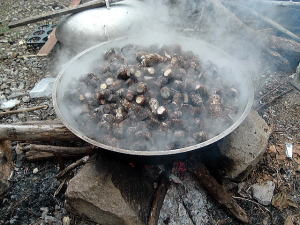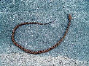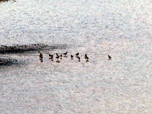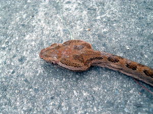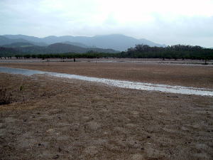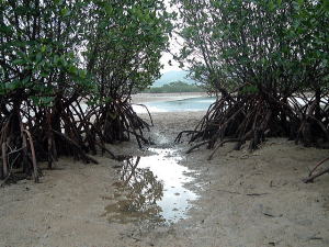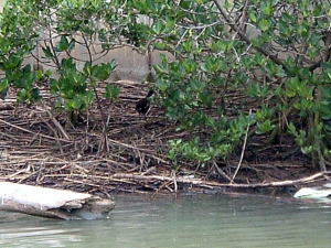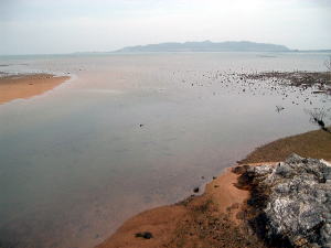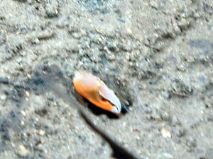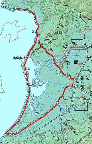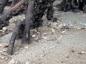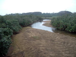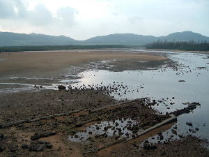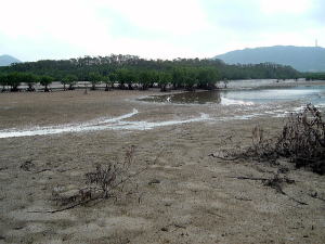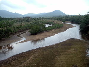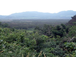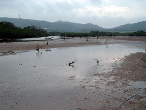7日目(最終日)◆石垣島:名蔵アンパル 姉とともにKさんの実家に泊めてもらい、とうとう八重山最終日の朝を迎えた。 Kさんの実家の近くに、「名蔵(なぐら)アンパル」というラムサール条約登録湿地がある。姉は昨日、Kさん宅の自転車を借りてじっくり見に行ったらしい。 そこで今度は僕が自転車を借り、前カゴに朝食のパンと缶コーヒーを放り込んでアンパル見学に出かけた。 赤線が自転車で走ったルート海沿いの道をしばらく南へ走ると、名蔵大橋にさしかかる。橋に踏み入れたとたん、左手に大きな空間が広がった。さっきまで左手に迫っていた山々がいきなりはるか遠くへと後退し、その手前がずっと先まで広大な干潟とマングローブ林になっている。 これだな、アンパル。 ![]() (左)名蔵大橋から見たアンパル (右)海への開口部 アンパルとは「網を張る」の意味らしい。ここに網を張っておれば魚が自動的にわんさか入ってくるのだろう。 それにしても、こういう場所が手付かずで残っているのはさすが八重山だ。本土ならとっくの昔に干拓されて水田になっているに違いない。でも漁労民にとってはコメより魚が大事だったのだな。 橋を渡って少し進むと、湿地に下りられそうな場所があったので、自転車を停めて下りてみた。 干潟は思ったより締まっていて、足が沈むこともなく歩きやすい。 細い流れに貝がいっぱいいる。それをまたぎ、干潟中央のヒルギが生えているところまで歩いた。 ![]() (左)アンパルに下りてみた (右)干潟は歩きやすい ![]() (左)アンパル風景 (右)ヒルギの根元にトビハゼがいる なんかしらんが穴だらけ歩いていくと、小さな生き物たちがいっせいに砂の穴に隠れてしまう。動かずにじっと待っていたら、トビハゼが出てきた。さらに注意深くじっと我慢していたら、片手の大きなカニたちが顔を出す。 カニは甲羅やハサミを持っているくせに、トビハゼよりもかなり慎重だ。 ![]() (左)トビハゼが顔を出した (右)シオマネキ、こいつを撮るのは根気との戦い 30分ほど観察して自転車に戻り、片手でパンと缶コーヒーの朝食をとりつつさらにペダルを踏む。しばらく進んだところでもう一度アンパルへ下りた。 ここはさっきの広大な干潟とはススキ類の森を隔てたようになっており、湿地の幅がやや狭いが、水鳥の姿が多い。そして砂にあいた穴は大き目だ。 アンパルはのっぺりした一枚の干潟ではなく、水流はいくつもの部分に分かれたりまたくっついたりしながら海へ流れ出ていくようだ。その複雑な流れの合間合間に多様なマングローブが生え、さまざまな生物にとっての隠れ場所や餌場があるのだろう。 ここでも下りてみた自転車に戻って再び南へ走ると、車道の隅にカラスが数羽集まって何かをつついている。追い払って見てみると、1匹のヘビが裏返っていた。こわごわしっぽをつまんで表に返してみると、ハブだった。 目立った外傷も硬直もなく、死んでるようには見えないがピクリとも動かない。カラスに振り回され、頭を道路に叩きつけられて失神しているか、あるいは絶命しているのか。 ![]() (左)ハブよね・・・ (右)間違いないよね・・・いきなり目を覚まして噛まないよね・・・ さらに進むと、北東方向に分岐する道があった。この道はアンパルの東にある名蔵集落に続いている。名蔵集落に出たところで左折したら、アンパルをぐるっと大回りで1周するかたちでもと来た海沿いの道に戻ることができそうだ。 だが行って見るとアンパルの東側は道路の両側がサトウキビ畑になっており、湿地に近づくことはできなかった。 途中、アンパルに流れ込む水路の一つに、水鳥たちが集まっていた。よし、鳥の写真を撮って、あとで姉に自慢しよう。 だが水鳥たちは非常に警戒心が強く、いくら注意深く動いても一定以上近づくことはできなかった。そうとう粘ったけど下の写真で精一杯。 ![]() (左)シギとチドリ (右)中央で後ろを向いているのはたぶんシロハラクイナ ![]() (左)アンパルへ流れ込む名蔵川 (右)その上流方向を見る 名蔵川を渡り、もう少しで海沿いの道に戻るというあたりに八重山民俗園がある。その周辺は湿地の際まで丘陵が迫っているため、自転車は少し丘を登らされることになる。 そのかわり、アンパルの東半分を一望できる。 高台から見たアンパル以上アンパル1周、2時間半の朝のサイクリングだった。 この日は1時発の飛行機に乗ることになっていた。Kさん宅をおいとまするとき、Kさんの母上が「石垣に来て川平湾を見ないとダメさ〜」とおっしゃるので、空港へ行く前にKさんのクルマで寄ってもらった。 さすが有名な観光地だけあって、小さな湾がコバルトブルーに染まっている。美しい海だが、潮流が早いため遊泳禁止らしい。 ![]() (左)グラスボートが浮かぶ川平湾 (右)たしかにきれーです 川平湾から空港へ向かう途中、再びKさん宅に寄り、庭の大鍋でふかしたてのターイモをおやつがわりにたくさんもらった。これまたモチモチのなんともうまい