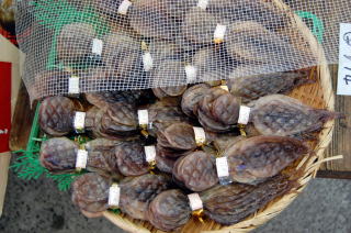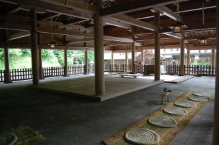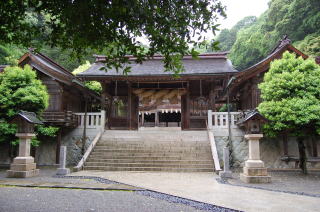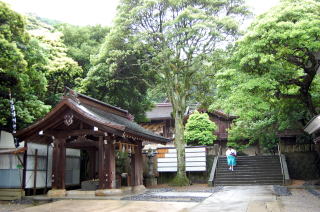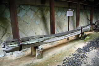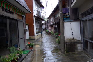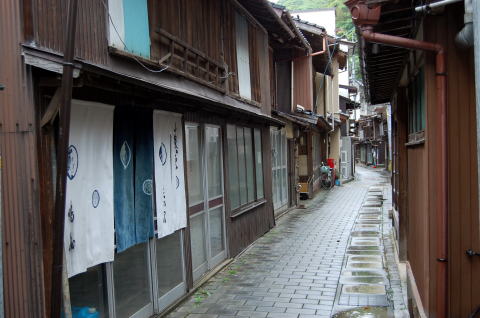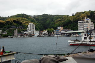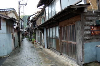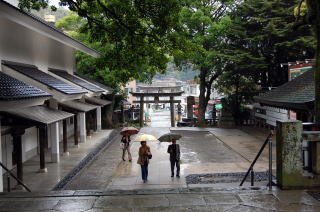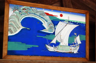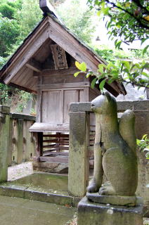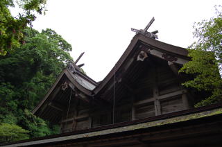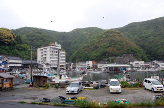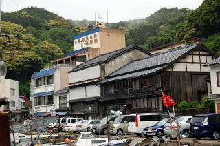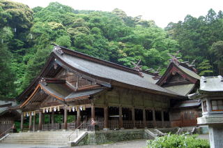(旅行から約1年半が経過してから書いています。記憶にあやふやな部分が多くてスマヌ・・・)![]() (地図右上のほうの赤い印が美保関) 境水道を抜けて日本海に出ると、とたんに波が高くなる。 人家のないさみしい海岸沿いの道がひとしきり続いたのちに、ぽんと小さな湾内に出た。 スプーンでえぐったような湾は周囲に山が迫り、海面を深い緑色に染めている。その水際ぎりぎりの線に沿って、建物が薄く張り付いている。 小雨のぱらつく美保関は、肌寒かった。 ![]() 美保神社 平成の合併で松江市の一部となった美保関だが、松江からはバスで40分もかかる、半島先端のドンツキ集落だ。 その湾奥の特等席に当たる位置に、この小湊の名を高めている有名物件、美保神社がある。とりあえずそこへご挨拶しときましょ。 糺大明神の祠美保神社の手前に、「糺大明神」という小さな祠があった。キツネがいるから稲荷なのだろうか。でも一般的な稲荷っぽくないし、このキツネも妙。どことなくあやしいケハイが漂っている。 小さな町だから、探すまもなく目的地に着いてしまう。 美保神社は荘厳な森を背負い、海を向いて鎮座していた。 ![]() (左)正面鳥居、左右に数軒の土産物屋あり (右)鳥居の内側、短い参道 ![]() (左)注連縄のある門 (右)神楽殿 いつごろできたのかわからん、とにかく古い神社だ。オオクニヌシの妻ミホツヒメと、息子のコトシロヌシを主神として祀っているが、元々はオオクニヌシの娘ミホススミだけを祀っていたらしい。 天神系(渡来系)のミホツヒメは、天上から稲作をもたらしたということで農業の神とされる。 また、出雲国を天神族に譲って海に沈んだコトシロヌシはエビスと同一視されたことから、全国の事代主系エビス神社3385社の総本山ともなっている。 ちなみにエビス信仰には蛭子系もあるが、それは西宮神社が総本山。 雨のせいか人気もなく、神社をすっぽりと包み込むような巨木たちが存在感をもって迫ってくる。背後の原生林のオーラがもうただもんやない。 うしろの拝殿と一体化したような神楽殿の豪華さが印象的だ。人口も少なく土地も狭いこの港で、これだけの広さをもって、いったいどのような神楽が舞われるのだろう。 立派な神楽殿その奥の拝殿・本殿もちょっと変わってる。大社造りを2棟連ねていて、美保造りと呼ばれる形式らしい。 ![]() (左)本殿の屋根 (右)神楽殿から屋根がずっとつながっている 人間の見当たらない拝殿でパチパチ写真を撮っていたら、どうも誰かに見られているような気がしてならない。 その瞬間、こいつと目が合った。 じいっと見るなよ!なんちゅーかこの神社には、外来者に対してここのウリをアピールしようというような魂胆がまるで感じられないな。ただ古く、潔く、堂々と鎮座するのみだ。その気高い態度そのものに迫力を感じる。 境内をよく見ると、ほかにもビジュアル的に味わい深い住人たちがさりげなくこっちを見てるやないの。 ![]() (左)この犬も奇妙 (右)ニャーン! ![]() (左)美保関の湊と美保神社の絵図 (右)入り口の門からは正面に海が見える 境内に1本の朽ちた材木が置いてある。そこの看板には、こんな話が書かれていた(松本意訳)。 明治29年、京都府丹後地方・岩滝の宝栄丸という船が水晶と但馬牛を積んでロシアのウラジオストクへ向かう途中、能登沖で暴風雨に遭って梶を折り、漂流することになった。乗員一同覚悟を決めて髪を切り、美保大神をひたすら拝んでいたところ、波間に大鯛が現れ、その鯛の導きによって夜明けに美保の岬に漂着した。 「乗組員一同歓喜に打ち震えつつ思わず神恩の宏大無辺なるを絶叫し」、その後船が湾口に達するや鯛はどこかへ消えていった。 「梶なき船鯛に導かれ、しかも祈願を籠めたる大神の港へ入りたるは、不思議中の不思議にして、全く厚き御神徳の外なし」 命拾いをした乗組員らは、その折れた梶をここへ奉納した。 それがこれ。 宝栄丸の折れ梶日本海沿岸は対馬海流が出雲から能登方面へと流れている。その大きな流れに逆らって、能登から美保へと流れ着いたというのはたしかに不思議だ。 しかし海流の脇には逆方向への対流が生じるともいう。 鯛が導いたかどうかはともかく、もしかしたら美保関はそうした漂流者が少ない確率ながらも漂着する、微妙な位置に突き出た港なのかもしれない。 そのことによって、ここが古代から海の信仰の総本山となってきたような気もするな。 あくまでもそんな気がするだけね。俺の勘をウノミにしないでちょうだいね。 美保のまちなみ 美保神社の脇から、青石畳通りと呼ばれる風情ある路地が延びている。ちょっとしゃれた店や旅館などが並んでいる。 かつて美保関は北前船の風待ち港として栄え、また田植え後の泥落としの参拝も盛んで、それらを接待する芸者もいれば劇場もあったという。 この通りはその栄華の名残りの道だ。 でも今は季節外れなのか雨のせいなのか、歩く人もなく店も閉まっているところが多い。 傘を