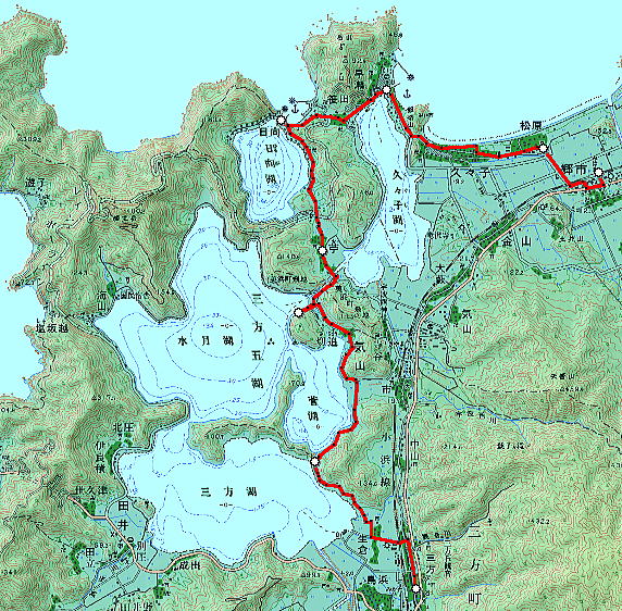 | 海の近くに5つの湖が隣接し、それらは複雑につながっていて、しかも淡水・汽水・海水とすべての湖で塩分濃度が異なるという三方五湖。 地図オタクにしてみれば、そのややこしい地形を見ただけで身震いしそうになる。しかも2005年には水鳥の重要な生息地・休息地としてラムサール条約登録湿地にも認定された。 でも、なぜかこれまで訪れる機会がなかった。 そこで、仕事がらみで近くまで行った翌日を1日あてて、のんびりと歩いてみた。 (ただし歩いてからすでに3ヵ月が経過しているため、記憶にあやふやな点がございます) ![]() 赤線が歩いたルート(上のほうから下のほうへ) |