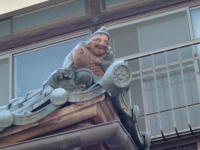 小屋根のすそにはえべっさんの2色鬼瓦