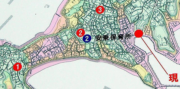 | 安乗は的矢湾の湾口に位置し、志摩市の中心・鵜方からバスで20分ちょっとの距離にある。 地図を見ると、安乗埼灯台のある先端部分から神社マークのところまでが島っぽくて、その左(西)部分がトンボロ砂州のようなウエストラインのくびれを見せている。 しかし今回のトンボロ観察の難点は、志摩地方特有の低い丘陵地だ。これは海成台地(隆起波食棚)と呼ばれる地形だが、ようするにトンボロ砂州を見下ろせるような山がないんよね。 安乗の中心部はくびれ部分よりも西、弁天崎から2手に切れ込んだ漁港とその周辺だ。バス停や郵便局、学校などはそこにある。 その中心部分とくびれ部分の間には標高15mくらいの丘があって、両者を隔てている。丘の上にも民家が密集しているようだ。 今回もさんざん行きつ戻りつ歩き回ったので、そのまま書いたのではワケわからんようになる。そこで、まずはこの手前の中心部分から順に見ていくかたちでまとめることにする。 ![]() (左)フグを水揚げしまくっている安乗漁港 (右)そこらじゅうでヒジキが干されている ![]() (左)港の近くにあった渋い建物 (右)周囲の丘はこれくらいの高さ。10mちょっとかな 志摩の漁港はどこも明るく活気があるが、安乗は熊野灘から遠州灘一帯のトラフグが最も多く水揚げされている港で、機能的に入り込んだコンパクトな湾内はフグ漁船の出撃基地といった趣だ。 漁港の東には急傾斜というかほとんど屏風のような角度で高台になっている。この丘が港とトンボロ砂州を隔てている。 丘に登って港を見下ろす斜面につけられた狭い階段を登って丘の上に登ると、湾内が一望できた。だが丘は高さはないがけっこう複雑な起伏があって、トンボロ方面は見えない。 下の図は、漁港(ケイ線が延びている赤丸)に立ててあった津波の避難に関する告知板の一部拡大写真だ。南北がさかさまになっている。 ![]() 色分けは標高を表している。ピンクは3m以下、オレンジは3〜5m、黄色は5〜7m、緑は7m以上。 くびれ部分は予想通りの低地だ。トンボロ砂州と考えて間違いないだろう。 赤丸のB付近からAへ歩いたが、まだ砂州は見えない。いったん下のオレンジ部分へ下りた。 ![]() (左)丘の上にはわりと立派な家が多い (右)丘の形状は複雑だ。いったん下りる |