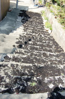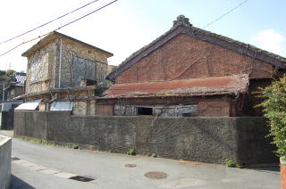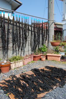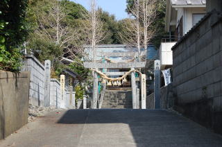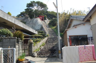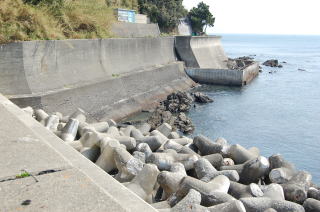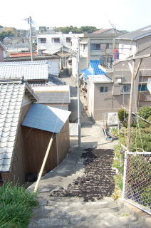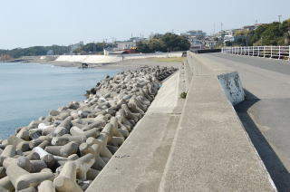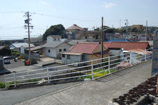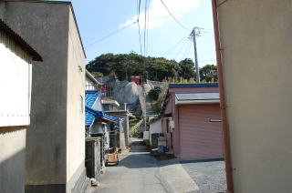 | 安乗神社には文楽(人形芝居)が伝わっていて、国の重要無形文化財に指定されている。 だが神社そのものは旧島部分のいちばん端っこギリギリにあって、こじんまりとしている。さっきの地図では赤丸@の場所。 この階段は表参道ではなく、拝殿の脇にある別社の稲荷社にたどりつく。 ![]() (左)階段の途中から見下ろす (右)階段拡大、ここもヒジキ干し場になっている 稲荷のがけっぷちは、このトンボロがもっともよく見渡せる場所だろう。 ![]() ![]() 中央やや左上の肌色三角屋根が安乗寺。そこから向こうが本来の志摩半島だ 砂州の幅は200mあるかないかといったところだ。 的矢湾に面した北の浜(写真右側)よりも、太平洋に面した南の浜(写真左側)のほうが堤防が高くガッチリとしているのがよくわかる。どちらの浜にも船の着く場所はない。 ![]() (左)こちらは安乗神社の正面参道 (右)子持ちの狛犬 上右写真の狛犬は足元に子どもがいる。神戸の垂水にある海(わたつみ)神社の狛犬も同じように子どもを連れている。子持ちの狛犬は海の信仰と何か関連があるのかもしれない。 安乗神社の表参道は、トンボロ砂州南岸沿いの道路が旧島へ登っていくところにある。こちらからは南の浜がよく見える。 ![]() (左)南の浜が旧島と合体する部分 (右)合体部分から志摩半島側を見る 北の浜よりも高く頑丈な堤防が築かれ、外側には波消しテトラが積まれている。これぞ太平洋だ。 安乗神社の文楽はこちら側の浜辺で奉納芝居が演じられるらしい。 |