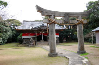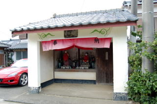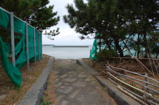 丘を左手に見ながら進み、やがて丘がほとんど姿を消したかと思われるあたりで、今度は右手にこんもりとした別の小さな丘が現れた。昔はポツンと浮かぶ小島だったのだろう。 前掲の地形図では、お寺のまんじマークがあるところ。 ![]() (左)トンボロへ向かう道を右に折れて小さな丘へ (右)丘の麓で東側の海に出た ![]() ![]() 堤防から陸繋島方面を見る。東側の海(富岡湾)は遠浅でおだやか。海岸沿いには松林が続いている 地形図によると、この遠浅の海は茶色いテンテンがついている。これは干潟記号だ。 なるほど、わかったぞ。 さっきの学校のある丘とこの小島とがL字型に囲む部分に溜まった砂、それがこのトンボロ根元のトックリ平野なのだな。 小さな丘は北側に階段があり、登ってみるとてっぺんに富岡神社があった。 その脇には、さっきのキリシタン供養碑を建てた代官・鈴木重成の供養碑がある。鈴木重成は乱後の窮民を救うために年貢の軽減を幕府に建言したといわれる、徳の高いお代官様であったらしい。 富岡神社拝殿、きれいに手入れされている富岡神社がある丘の北側にまわると、そこから先は陸繋島まで続く平たい土地が続くのみとなった。 まっすぐな道の両側に家々が立ち並んでいる。地図を見るとこの先はまさしくバチ状の狭い地峡帯になっている。 ここからがいよいよ正真正銘、トンボロの町だ! やっと来たトンボロちゃん |
