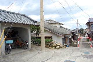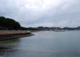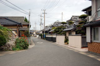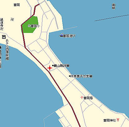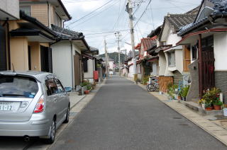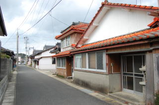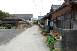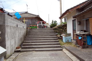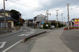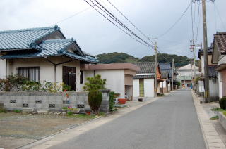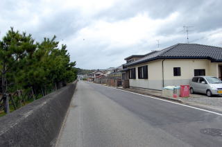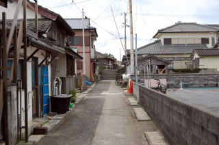 トンボロ部分拡大左右を海に挟まれた狭いトンボロ内は、ひっそりと静まり返っていた。 まっすぐに並ぶ家々はわりと古い木造家屋が多い。 ![]() (左)趣のある朱色の瓦の家 (右)富岡トンボロの中心、ピカピカの富岡公民館 右上写真が、このトンボロで唯一といっていい近代的な建物だ。正面に「海抜4メートル」と書いてある。 この先、トンボロは最も狭くなる。 狭いところを2本の舗装道路が走っている。上の写真の道は、トンボロ内部のメインストリート。これとは別に、西岸の堤防上に国道がある。 左下写真はメインストリートから堤防方面を見たところで、土地が少し高くなっていく様子がわかる。 右下写真は逆に東岸側を見たところ。左右に走るメインストリートのすぐ先、正面の2軒の家のスキマから東岸の松林がのぞいている。 ![]() (左)トンボロ西岸の堤防方面を見る (右)東岸の松林を見る つまり、これがトンボロの幅だ。100mちょっとしかないぞ! ほそーい! 西岸の堤防へ上がってみよう。 ![]() (左)西岸の堤防へ続く階段 (右)階段を上がった堤防台地にも道がある ![]() (左)堤防台地からトンボロ低地を見下ろす (右)堤防上の国道 ![]() ![]() ![]() 堤防から見た西岸。左が天草下島方面、右が陸繋島方面 おだやかな東岸とは違って、ここ西岸には天草灘からの風浪が直接打ちつける。だから堤防は東岸よりも高く、真新しく整備されていた。石積み護岸によって砂浜はほとんどなし。 しばらく海を見てからトンボロ内に戻り、さらに陸繋島へ向かって進む。 ![]() (左)堤防上と堤防下の建物の高低差がわかる (右)堤防を下りると、トンボロ中央部に井戸があった ![]() (左)角に木の茂った素敵な家 (右)陸繋島(正面)が近づいてきた トンボロ内唯一の商店ちなみに、上の拡大図によるとこのトンボロ内には「林芙美子文学碑」や「頼山陽詩碑」があるはずだが、このときは気づかなかった。 文人が訪れる、詩情をさそう風雅なトンボロであったのか。 |