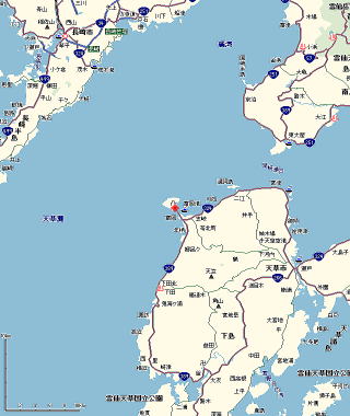 天草下島の北西端に、なにやらトンボロらしき特徴的な地形を見つけた。 ![]() (左)富岡の位置(赤印) (右)天草灘周辺(赤印が富岡) |