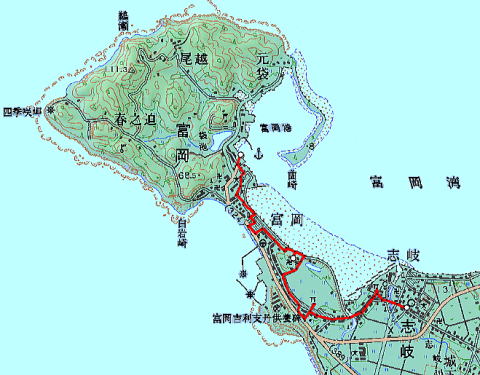 地図を拡大してみよう。 赤線は歩いたルートこいつはもう、どう見てもバリバリのトンボロでんがな。 トックリ状に膨らんだ根元からスーッと砂州が伸びて島をつかまえておるではありませぬか。しかもトンボロを貫いて国道324号線が走り、いちばんクビレたところがしっかりと町になっているようす。 これこそトンボロの町といわねばなるまいて。 でも陸繋島の標高が低いから、ダイナミックな鳥瞰を得るのは難しそう。 |