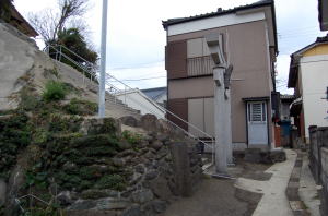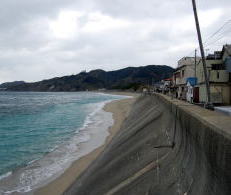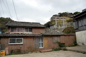 祇園山に登ってトンボロ全体を眺めるため、南へ向かう。堤防を歩いてもおもしろくないので再び集落内の細道をゆく。 祇園山はすぐそこだ ![]() (左)これこれ、この狭さがトンボロだ (右)渋い! クール! トンボロの幅の一番狭そうなところに立って、左右(東西)を見てみたのが下の2枚。 ![]() (左)あっちは東岸の漁港 (右)こっちは西岸の堤防 このへんの砂州の幅は100mないのではないか。 まもなくトンボロの末端に突き当たると、右上方に鳥居が見えた。そこへ登ってゆく。 ![]() (左)あれが祇園さんの鳥居だな (右)行き止まりにあった祇園社 少し登っただけで社があり、道は行き止まってしまった。この上はヤブコギしても展望は望めそうにないので、ここからの眺めで我慢することにした。 ![]() 祇園社からの眺めなんとか全体が見渡せた。カタカナの「ト」を寝かした形に見える。 九州本土とこの祇園山をつなぐか細い砂州の上にびっしりと集落が密集していることがわかる。もし大津波が来たら・・・考えるだけでも恐ろしい。 しかし、これが日本なのだ。 日本人は常に自然の驚異と向き合って生きている。このことはトンボロに限らず、これまで各地を旅してきて嫌というほど思い知らされた。 |
