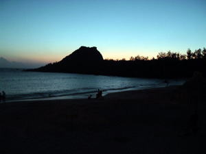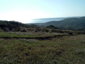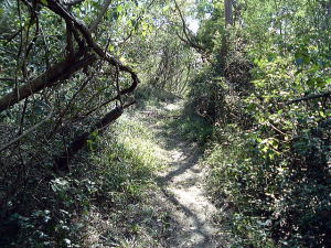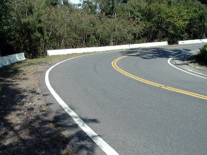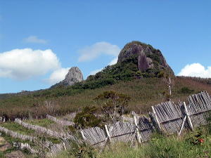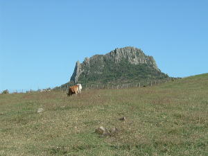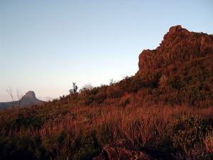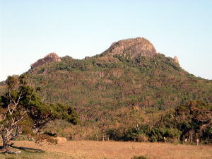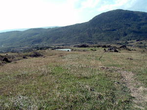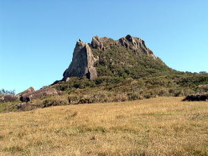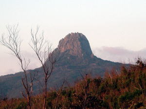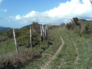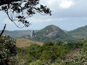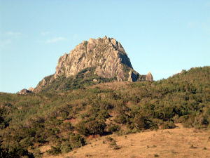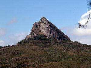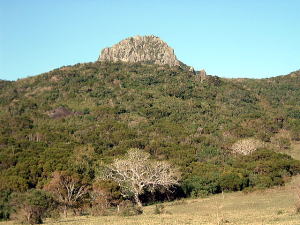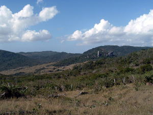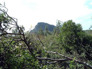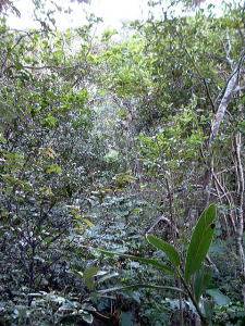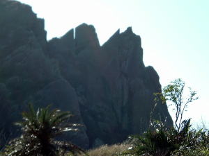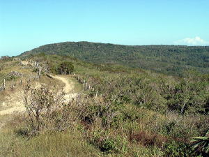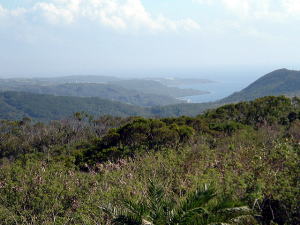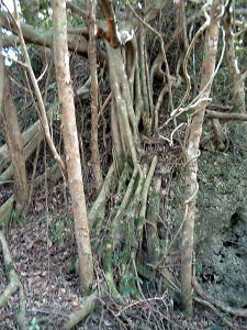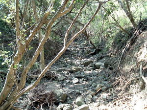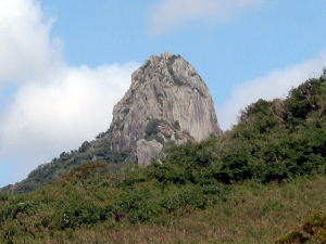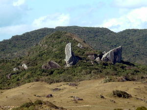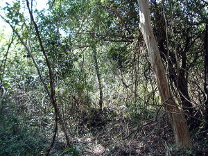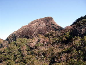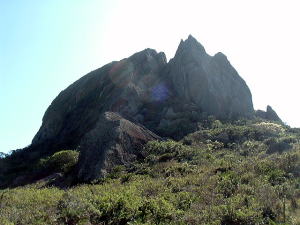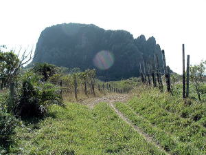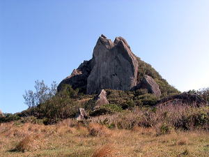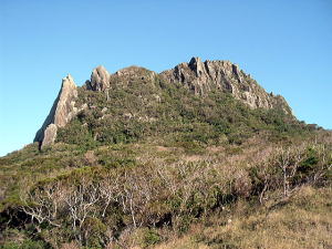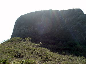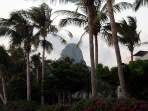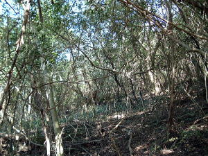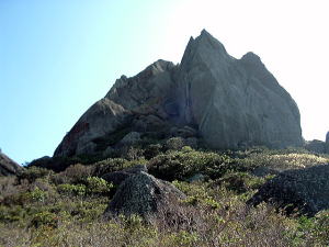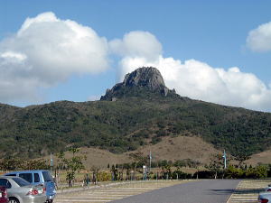 寒くなってきたし、台湾にでも行こうかな〜。そう考えた俺は、近所の本屋でガイドブックをペラペラめくっていた。 しかし最近のガイドブックはレストランとホテルの紹介ばっかりやのぉ〜、と溜息をヒトツついたとき、俺の目はあるホテルの写真にクギヅケになった。 おやっ!台湾最南端の墾丁(けんでぃん)というところにある、プールやゴルフコースまでついた豪華なリゾートホテルだ。 いや、そんなホテルなぞどうでもよろし。このホテルの背後に、なにか気になる突起があるやんか! 調べてみたらこの山は大尖山(または大尖石山)。台湾に大尖山と名のつく山は多いが、その中でもこの墾丁のシンボル山が最も有名なんだと。 しかし目立つ山でありながら登山レポートはどこからも出てこない。唯一、ウィキペディアにこう書かれてあった。 「墾丁森林遊楽区ゲートより入山し、墾丁牧場を経て稜線沿いのルートとなっている。山頂からは恒春半島全域が眺望できる。山頂までの往復所要時間は約3〜4時間である。 」 おぉ、楽勝のハイキング気分で登れそうやん。 というわけで、台湾南部の中心地・高雄(がおしょん)にやって来た。12月の下旬やっちゅーのに気温は28度くらいある。ついつい夜市でビールを飲みすぎちゃうねぇ。 駅近くの安ホテルに泊まり、翌朝8時に墾丁行きのバスに乗るべく駅前に出たら、おばちゃんが必死に声をかけてくる。 「バスはあちこち停まって370元、タクシーならノンストップで300元!」(1元=約3円) 乗り合いタクシーらしいが、バスより安いて速いなら文句はない。そこで、地元の学生ぽい男女らとともに同乗した。 タクシーが自動車専用道をがんがん南下するにつれ、左手に台湾の中央山脈が見えてくる。富士山より高い山々が連なるこの巨大山脈が海に没するところ、それが台湾最南端の墾丁だ。 つまり今回のターゲットは、その山脈が海に沈む直前に一声ガオーっと吠えたような按配になっとるわけだ。 バスだと3時間かかるところを、タクシーは1時間40分で墾丁に到着した。おぉ、すぐそこに聳えとるがな大尖山。横から見たら魚のヒレみたいだぞ。 墾丁は、フィリピンとの間のバシー海峡に面した熱帯のリゾート地で、美しい砂浜が広がる楽園だ。 「引き続き周辺の観光ポイントを1800元でまわろうか?」と筆談で訴える運転手の勧誘を断り、美しい海に目もくれずに、さっそくウィキ情報に従って森林遊楽区ゲートをくぐった。 ![]() (左)墾丁森林遊楽区の立派な中華ゲート (右)ゲート横の駐車場(南西側)から見た大尖山 きれいに整備された車道を登ってゆく。気温30度、さっそく汗が吹き出てきた。 200mほど歩くと左に分岐する道があり、その向こうに牧場が広がっている。分岐点には看板が取り付けられ、なにやら漢字がいっぱい書いてある。 「大尖山・・・厳禁・・・岩石剥落・・・牧場立入・・・」 少なくとも、どうぞお登りくださいと書いてないことはわかる。 でもま、ここから牧場に立ち入って登るのは危ないからダメだよ(=だから別の道から登るならいいんだよ)、と親切に書いてくれていると解釈しよう。だって中国語ワカランもんね。ワカランときは熱烈歓迎だよ兄弟、ははは。 ガイドブックのいいかげんな地図によると、この先の墾丁賓館というホテルを越えたあたりから、大尖山の北東方面へ入ってゆく道がある。ウィキペディアのいう「稜線沿いのルート」とはそれのことだろう・・・と勝手に決めて、元の舗装道路をさらに登っていった。 道路はゆるいカーブを描きながら高度を上げ、山の南から東へとまわり込んで行く。山側には木の柵が連なり、その向こうはずっと牧場になっているようだ。 道路脇にたくさん落ちていた木の実 ![]() (左)ちょうど真南あたりから、左奥が大尖山 (右)大尖山拡大、白い岩肌が美しい 大尖山の南には小さな岩山があり(上左写真の右手前)、その西側が牧場、東側は森が広がっているようだ。 ![]() (左)30分ほど登ったあたり(南東側)から。麓は森に覆われている (右)拡大。先っぽピンピン 歩き出して40分ほどで墾丁賓館の前を通ったが、それらしい道はない。道を探しながらなおも登り続け、結局ゲートから1時間ほど歩いて森林遊楽区の入口に着いてしまった。おかしいなあ。 駐車場係のおばちゃんに、大尖山を指差しながら「うぉしゃんちゅ、しゃん(山に行きたい)」と訴えると、無愛想に首を左右に振って「ダメだ」というようなことを言う。「ようまーるーま?(道はありますか?)」と聞いても、しかめっ面で「メイヨー(ない)」とニベもない。 仕方がないので来た道を下り、墾丁賓館の周辺を再度探索することにした。 途中の斜面にある踏み跡を探ったりしつつ下ってゆく。森林遊楽区の駐車場を出て30分後、墾丁賓館の少し上のカーブ付近で、ついにそれらしき道を見つけた。 ![]() (左)左側の路肩の切れ目の、もひとつ下の切れ目 (右)ここだ! 道らしきものがある 喜び勇んでそこから突入した。時刻は11:20。 すぐに小さな橋が
