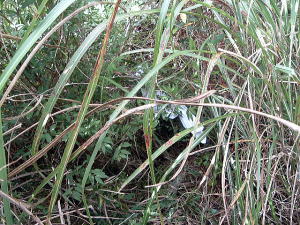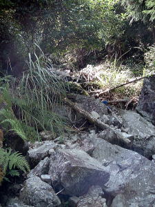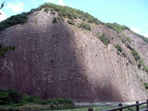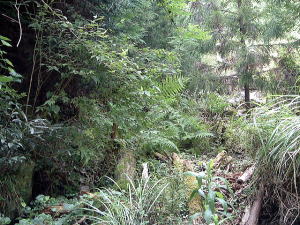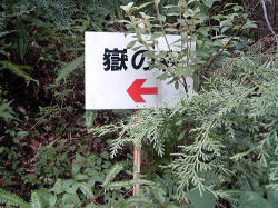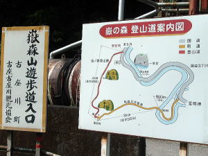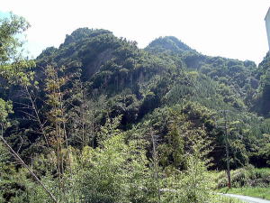 | 【敗退編です・・・】 「日本の桂林」とも言われる古座川峡。そのシンボル・一枚岩の向かいで、ちょっとブキミに聳える山。上ノ峰と下ノ峰からなる。標高は低いが、その峻険な地形はナメてかかった人を陥れる。 そのナメてかかって登頂を拒まれた愚か者、俺だ。ははは。俺のような目に遭う人が今後出ないことを願い、恥を忍んで報告したい。(半年後の登頂編はこちら) 青春18きっぷで約6時間、本州最南端を回ってやっとこさ古座駅着。30分ほど待つとバスが来るが、このふるさとバスは一日2本しかないから、狙いすまして行動する必要がある。 しかも、帰りのバスは2時間後。それをのがしたら帰れない。 つまり、登って下りるまでのタイムリミットは2時間。過去に登った人の記録を見ると、山頂での休憩を入れてもおおむね2時間半そこそこで下山しているようだから、急げばなんとか間に合うだろう。 これが最初の落とし穴だった。 ![]() (左)一枚岩、高さ100m (右)トンネル横の登山口付近から見た嶽ノ森山。近すぎて山容がわからない 美しい渓谷を走るバスに揺られて約30分、一枚岩の少し手前の国道相瀬橋近くに、新しく整備されたらしい登山口がある。ここから登れば確実に2時間以内で戻って来れそうだ。 でも、もう少し上流の一枚岩トンネル近くに古い登山口があり、そっちから登るほうがナメトコ谷なんかがあって面白そう。せっかくだから、そっちから登ることにしよう。 これが第二の落とし穴だった。 ![]() (左)じつは「注文の多い遊歩道」だった (右)鹿よけネットの向こうに小さな道標発見 1kmほど上流へ歩いて一枚岩トンネル右の道に入ると、工事現場のようなところに登山口を示す看板あり。「遊歩道入口」とある。事前の調べ通り。 「遊歩道」です。超楽勝決定。だから今回は地形図を持って来なかった。当然だろ? これが第三の落とし穴だった。 「遊歩道入口」を進むと、すぐに道がなくなる。「おや〜?」と思いつつもススキをかきわけて踏みあとを探し、植林帯へ入ると、黄色い鹿よけネットが行く手を遮る。よく見たらその向こうに「←嶽ノ森」という看板が出ている。 ホッとしてネットをくぐり、踏み跡をたどるが、完全に廃道状態。このあたりは屋久島と並ぶ日本有数の多雨地域なので、整備を怠るとすぐに道はなくなるのだな。 まあ入口であの荒れようだったから、この程度の荒れ方は仕方ない・・・って、あれ〜? 踏み跡はあるけど、これ、どう考えても登山道ではありません。なんかしらんが俺、四つんばい。普通ならここで引き返すわけだが、時間もないし、多少道を外れてようがこの沢を辿ればいずれナメトコに至るんだろ、行ってやれ。 年甲斐もなく突撃沢を詰めヤブをかけわけて登れど、ついにナメトコは現われないまま源頭部へ。現在地はどこだ〜地図がほしいよう。 とりあえず尾根に出よう、踏み分けくらいはあるだろう。 しかしイバラと岩に阻まれ、尾根の下でついに進退きわまった。半袖Tシャツで登っていたため、腕はイバラで傷だらけ。首にかけていたタオルもどこかに消えている。 このところピクニック的な楽勝の山ばかり歩いてたからな。判断力が完全に鈍っていた。イバラに全身を包まれて身動き取れない棒立ち状態で、とりあえずお茶を飲む。 ここから今来たイバラ道を戻ることを考えるとウンザリするなぁ。 進退きわまりポイントでいちおう記念写真でもこんなこともあろうかと・・・イバラに気をつけながら、そーっとリュックから生協の雨ガッパと軍手を取り出す。フードもかぶって完全武装。ははは、もっと早くこうしとけよ。 一気に気持ちが大きくなってガンガン下る。愛しのタオルちゃんも回収。 キミがいないと銭湯で困るのよほとんど登山口近くまで下ったとき、谷から南側斜面を急登する踏み跡発見。 試しに登ってみると、こいつが現われた。 今ごろナンダこのとき俺は思い出した。事前の調べでは、ナメトコへは、登山口からトンネルの上の尾根を越えて隣の谷へ入るのだった。あまりのルートの荒れように気をとられ、そのことを忘れていたよ。ははは。まあ地図がありゃそんなの間違えようもないんだが。 でももう1時間も費やしてしまったので登頂はあきらめ、スゴスゴ下山する。 ![]() (左)魔の分岐点、ここに看板があれば・・・。右下から登ってきたら直進せず、鋭角に左折すべし (右)登山口に戻って観察したら、隣の谷にナメトコの岩場(上部)が見えていた それにしても炎天下の雨ガッパというのはサウナスーツ状態だ。バケツの水をかぶったみたいにズブ濡れになった。 その直後、10分間ほど猛烈な夕立が来た。ヤブの中で遭遇してたらヤバかったかも。 時間が余ったので、そのへんをのんびり歩いて山の写真を撮ったりしながらバスを待つ。猛烈に悔しいので、時期を改めて再度同じルートから登ることを固く決意した。 (05.8.20) 新登山口にある看板。よい子はこっちから登りましょう ![]() (左)この看板は一刻も早く