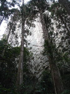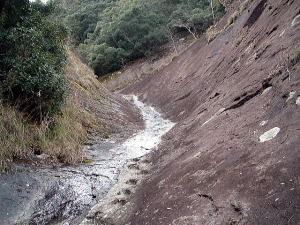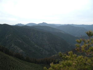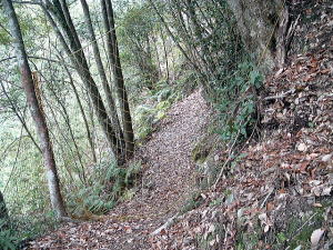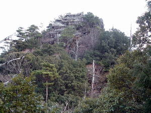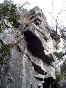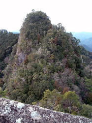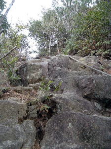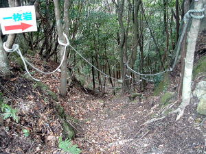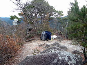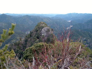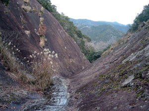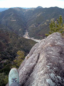 | 「日本の桂林」とも言われる古座川峡。そのシンボル・一枚岩の向かいで、ちょっとブキミに聳える山。上ノ峰と下ノ峰からなる。標高は低いが、その峻険な地形はナメてかかった人を陥れる。 半年前の夏にナメてかかって登頂を拒まれた俺が言うのだから間違いない。ははは。 というわけで季節は草木も眠る真冬。朝の6時半から青春18きっぷを使い、神戸から約6時間かけてリベンジに向かった。なにしろこの半年間というもの、こいつのせいでスッキリしない日々を送ってきたんだからな。 前回同様、紀勢線の古座駅から一日2本のふるさとバスで一枚岩へ。そしてやはり帰りのバスまで2時間きっかりのタイムリミット。 コースももちろん前回と同じくトンネル手前の「遊歩道」だ。もう迷わないぞ。 勝手知ったるトンネル前、「遊歩道入口」の看板を通り過ぎてススキの原へ。ざまーみろ、さすがに枯れてやがる。しかも前回見られなかった踏み分け跡があちこちにあるぞ。 植林帯へ入って黄色い鹿よけネットをくぐる。「←嶽ノ森」という看板で、矢印の方向に忠実に、沢の踏み跡に惑わされないよう左の斜面へ進むのよね。 あれあれ、前回1時間もかかった斜面の登り口まで2分で着いちゃった。 あとはもう、けっこう整備された登山道が続く。山腹を急傾斜で登ってゆくが、ややこしいところには赤テープもあって間違えようもない。何度か鹿よけネットをくぐる。 見えにくいけど、鹿よけネットが道をふさぐ20分ほど登ると、念願のナメトコに到達。なるほど、これはおもしろい。スノボーのハーフパイプだな。 大雨の日はどんなふうになるのか見てみたいもんだ。 ![]() ご親切にも岩にステップが刻まれている 来し方を振り返る数百メートル続いたナメトコを通過すると、またもや樹林帯に入って急な登りとなる。やがて尾根に出ると天柱岩方面への分岐があり、もう少し進むと一枚岩への分岐。下山時はここからか。 最後の岩場をロープをつかんで登り切ると、ついに頂上だ。登山口から40分くらい。四方に雄大な紀伊山地の眺望が広がる。 いやー、前回屈辱にまみれただけに感無量だわ。汗を拭きつつ、しみじみ・・・。 ![]() (左)もうすぐ頂上なケハイ (右)けっこう広い山頂、リュック左の小さな祠はカラッポだった ![]() (左)すぐ前に下ノ峰 (右)北には累々と続く紀伊半島の山々 ところで、嶽の森山は上ノ峰(雄嶽)と下ノ峰(雌嶽)からなる双耳峰だ。今いるのは上ノ峰で、正面に下ノ峰へと続く道がある。時間的には大丈夫そうだし、行ってみよう。 どうせまたここへ戻って来るわけだから、リュックは置いて空身で行くことにした。 下ノ峰へはいったん鞍部まで下って登りなおす。しかしどこまで下りるのよせっかく登ったのに。あとで登り返すことを考えるとウンザリするような急坂をやっと下りきったところに・・・! 一枚岩への下山道がある〜(涙)。 あるんならあると、はよ言わんかい! しかもここから下りるほうが、頂上手前にあった分岐からより早そう・・・畜生、リュック置いてくるんやなかったよ〜。 泣きながら下ノ峰へと登る。こっちのほうが岩場が多いし痩せている。 ![]() (左)上ノ峰と下ノ峰の鞍部から見上げる下ノ峰 (右)巨人の顔に見えると言われる巨岩 オーバーハングした巨岩の背後に回りこみながら登ってゆくと、またカラッポの祠があって、そのすぐ後ろが下ノ峰の頂上だ。上ノ峰から10分ほど。 頂上は細長く左右に伸びる岩のエッジになっている。そこへ一歩近づくごとに姿を現す上ノ峰の姿がすばらしい。エッジにまたがると、お尻ひょわぁ〜の高度感。 上ノ峰の頂上は狭いながらも面だったが、こっちは線だ。そして下はスパーンと断崖。 ![]() (左)お? (中)おぉ! (右)おおお〜! (すみません、いったん戻って撮ったヤラセ写真です) ![]() (左)あのてっぺんまでリュック取りに戻るのね・・・ (右)先端の岩にまたがって俺最高 さてと。リュック取りに戻るとするか。またもや鞍部までいったん下りて、さっきの激坂を登りなおす。ぐひ〜、この登りが今日いちばんキツイ・・・。 ふたたび10分、2度目の上ノ峰登頂で汗ボトボト。 石に座り込んでパンを食っていると、真上をトンビが4羽ほど旋回している。そのうち1羽と目が合った。俺のパンを狙っているのだな。やるもんか。 さてと。バスの時間まであと45分、そろそろ下りよう。 またもや下ノ峰との鞍部へと下る。この半時間ほどでこの道を通るの3回目・・・。 鞍部の分岐点には鹿のフンがたくさんある。そこから真新しいロープにつかまって急斜面を下り、あとは杉の植林帯をジグザグに下ってゆく。 植林帯の北側には嶽の森山南面の大岩壁が終始そびえていて、すごい迫力だ。 これは数年前に整備されたとみえる新しいルートで、はじめのうちはわかりやすいが、しばらく下ると階段状に組まれた間伐材が朽ちてきており、道も落ち葉に埋もれて判然とせず、早くも山に還りかけている場所が散見される。このままあと2年も