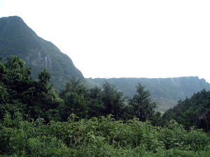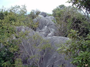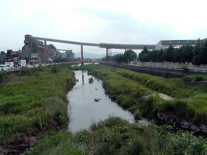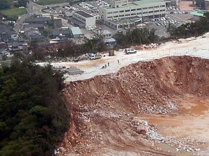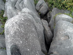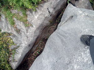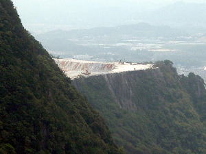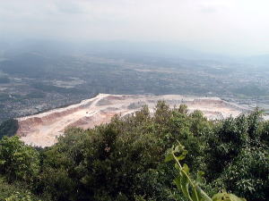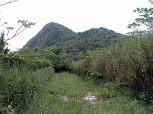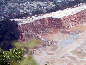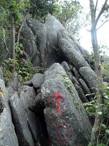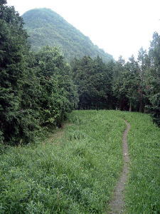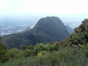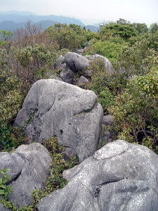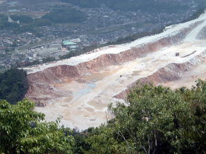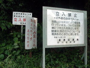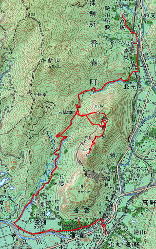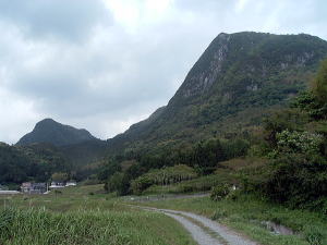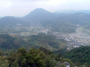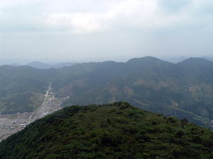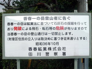 | 「〇〇は〇〇である。」で始まる小説といえば夏目漱石の『我輩は猫である』が有名だが、五木寛之の大河小説『青春の門』はこんなふうに始まる。 「香春岳は異様な山である。」 そしてそのあとさらに、「その与える印象が異様なのである」とか「その醜い姿」などと、執拗にその異様さが描写される。 その「異様な山」に登ってきた。 香春岳は一ノ岳、二ノ岳、三ノ岳からなる3連山だが、たしかに異様な山だった。 北九州市の小倉から約40分。JR日田彦山線の車窓風景は、市街地から田園地帯、山村へとすばやく移り変わってゆく。やがて石灰採掘のために大きく削られた山々が左手に見えはじめ、しばらくすると列車はトンネルに入る。 トンネルを抜けると、そこは筑豊と呼ばれる地方だ。 最初の駅が「採銅所」。この無人駅で列車を下りる。 香春岳3連山のうち、南端の一ノ岳は登山が禁じられている。石灰採掘のために山自体がズバーンと真横にぶった切られているらしい。二ノ岳にも採掘会社による林道が開かれているもよう。 登山対象としてポピュラーなのは北端の三ノ岳で、その場合はここ採銅所が登山口になる。 俺もとりあえずここから三ノ岳に登ることにした。 赤線は歩いたルート(上方から下方へ) ![]() (左)採銅所駅 (右)採銅所駅の北側踏切から見た三ノ岳 採銅所は、かつて宇佐神宮の神体鏡を作る銅が採れた場所であり、奈良の大仏を作るときにもここの銅が使われたらしいが、今は銅は出ないのだろうか。 駅の近くにいたバーサマに聞いてみたら、「今は掘っとらん。大昔の話たい」とのことだった。それにしては、まるで現在採掘中みたいに生々しい地名だな。 しかし、古い時代に金属採掘が行なわれた場所には、たいてい謎めいた古代史が色濃く残っているものだ。この山周辺も例に漏れず、渡来人系の神社がいくつもある。 新羅の王子とされるツヌガアラシトを祀った現人神社や、彼が朝鮮半島から追ってきた女性(ヒメコソ)ではないかとも目されるトヨヒメ(三ノ岳の神)を祀る古宮八幡などを見てまわることに1時間ほど費やして、11時半にようやく登山口近くの採銅所小学校へ。 ![]() (左)謎を秘めた古宮八幡の拝殿 (右)採銅所小学校は校舎改築中だった ここから西へ、三ノ岳の北側をまわって五徳峠まで車道を歩く。 銅の精錬を行なった場所といわれる清祀殿を過ぎてしばらく歩くと人家はなくなるが、谷を上がるにつれて見晴らしが良くなる。周囲は伐採されて数年くらいで樹木が伸びておらず、まるで高原のようだ。 三ノ岳北面に岩が露出したところが何ヵ所かあるが、もしかしたら銅を採掘した跡なのだろうか。 早くも腹が減ったのでオニギリを食べながら歩こうかとも思ったが、あちこちに「猿にエサをやるな」と書かれてあるので、なんとなく躊躇。だって猿が出てきてモノホシそうに見られるのはイヤだ。 ![]() (左)三ノ岳北面の露岩 (右)五徳峠が近づくと三ノ岳はピラミッド型にある 30分あまりで五徳峠に着く。三ノ岳東側の採銅所からぐるっと西側へ回り込んだかたちになる。 ここでたまらずオニギリを一つ食べてから、三ノ岳の登山道に入る。前日が雨だったためにぬかるんですべりやすいが、道はよく整備されている。 ![]() (左)五徳峠から三ノ岳への道 (右)アマドコロ、根を煎じて飲めば滋養強壮・美肌色白などによろしいようです まもなく道が「岩登りコース」と「ファミリーコース」の二手に分かれる。前者は正面尾根の直登、後者は薄暗い植林地帯に道が続いている。 岩登りっつったって道具を使うようなクライミングじゃないだろうから、そっちを選ぶ。 すぐに岩稜が現われ、そこを登っていく。岩は石灰岩、しっかりしていてすべらず、つかみやすい。表面がギザギザだから軍手が有効。 しかも赤ペンキの矢印がたくさんあってルートを探す必要がまったくない。岩場の登りはルート探しに神経を使うが、ここはもう矢印通りにがしがし登るだけ。まるでフィールド・アスレチックだ。 高度が上がると展望が開け、南に二ノ岳と筑豊の平野が見渡せるが・・・ややっ、二ノ岳の向こうに、肌色の輪切りチクワみたいなのがチラッと見えているぞ。 あれが石灰採掘中の一ノ岳だな。確かに異様だよ五木さん。 ![]() (左)二ノ岳と、その影にチラリと一ノ岳 (右)一ノ岳拡大、重機のようなのが見える ガガガガ、ガララーン、ガガガガ、ガララーン、・・・。 一ノ岳のほうから、山を削るすごい音が聞こえてくる。うひあ。 とりあえず三ノ岳を登ってしまおう。 ![]() (左)矢印通りにどんどん登る (右)そろそろ頂上も近そう 大きな岩のゲートのようなところを越えると、頂上に出た。 が、頂上といっても、100m以上にわたってバラバラの岩たちが脈々と細長く連なっている。こりゃまた変わった頂上だな、腰を下ろすこともできやしない。 ![]() (左)なんだよこの頂上は (右)ここが最高ポイントのようだが、どうしようもないぞ 足元グラグラしながらピョンピョンと岩から