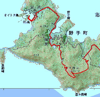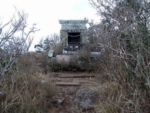 これまでに登ったふしぎ山の中でも特筆すべき、強い印象の残る山だった。 平戸島は、「本土から船に乗らずに行ける最西端の島」。全長30kmを超える大きな島で、南端部は細長い半島が東シナ海に突き出している。 その半島に、大昔から霊山として崇められる、この尖った山がある。 冬の最西端の夜明けは遅い。6:45の宮之浦行き始発バスは、俺一人だけを乗せて、真っ暗な平戸桟橋バスターミナルを出発した。 島の北部にあるバスターミナルから南の半島部へは1時間以上かかる。海岸沿いに南下するうち、少しずつ夜が明けてくる。 この山に登るには半島中央部の野子バス停からが近いが、俺はバス終点の宮之浦までいったん行くことにした。 宮之浦は「本土から船に乗らずに行ける最西端の集落」だ。つまり本土から見たら「最果ての地」ということになる。だが、古代には逆に、ここは大陸文化が日本で真っ先にやってくる最先端の港、つまり日本本土の玄関口だった。 志々伎山への信仰は、そのことと深い関係がある。 赤線が今回のルート8:10に宮之浦に着いた。風がきつく、雨なのか雪なのか、細かく冷たい水分が飛び交っている。 そういや前日に見たテレビの天気予報では、「明日の長崎県はこの冬一番の冷え込み、天気は雪、強風波浪に警戒が必要です」と言っていた。 上等だ。最果てには荒れ模様が似合う。 尖った志々伎山は、古代の海路の重要な目印だった。波高い東シナ海を渡り、この山に導かれて辿り着く宮之浦には、湾内の小島に「沖津宮」、浜辺に「辺津宮」が祀られ、守護神たる志々伎山の中腹に「中津宮」、山頂に「奥津宮(上津宮)」が祀られた。 この四つを総称して志々伎神社という。 三つの宮が1セットになった神社はよくあるが、四つセットは珍しい。志々伎神社は古来より、壱岐・対馬を除く長崎県域では最高位の社格を有してきたという。 意外にも、宮之浦港からは志々伎山の姿が見えなかった。 冷たい強風になぶられつつ沖津宮・辺津宮をまわってから、バス道を2kmほど歩いて戻る。小さな峠を越え、東の福良湾側に抜けた瞬間、ようやく志々伎山の尖鋒が目に飛び込んでくる(冒頭写真)。 山頂部はまるで矛先だ。空に向かって人差し指を突き上げたようにも感じられる。 湾に沿って南へ歩くと、山は少しずつ姿を変える。 ![]() (左)福良湾の入口付近からのアップ。岩塔右の切れ込みが目を引く (右)福良湾の奥から 福良湾のいちばん奥でバス道から離れ、山に向かう農道に入る。強風に舞っていた水分ははっきり雪になった。 貯水池を越えて少し登ると、野子から登ってくる道と出会う。俺は宮之浦でバスを降りてから1時間以上歩いているが、素直に野子から登っていれば10分ほどだろう。 すぐに中津宮(中宮)の鳥居が見え、奥に古い参道が続いている。山腹に車道もついているが、ここはやはり古い参道を登るべきだろう。 参道は苔むして鬱蒼としている。幅の広い尾根道が大きくえぐられ、露出した岩盤が削られて階段になっている。古来から相当な数の人々がこの参道を行き来したようだ。 ![]() (左)中津宮の参道入口の鳥居 (右)参道 参道はけっこう急な登りが長く続き、この寒いのに一汗かかされる。15分ほど登るとポンと舗装道路に出て、9:45に中津宮に到着。 ![]() (左)真新しい拝殿。これを再建するために車道を作ったのだな (右)旧参道終点にある中宮跡 中津宮の右側車道を少しゆくと地道が分岐し、そこを入ると中宮跡がある。昭和の末期までここに中津宮があったらしい。 その先から道はぐっと狭くなり、いよいよ山道がはじまる。 ![]() (左)志々伎山頂への道 (右)少し登るとマキの巨木がある 最初は樹林に囲まれているが、間もなく岩場が多くなる。ロープが設置されているが、そう危ない場所はない。この山の南面はズバッと東シナ海に切れ落ちている。道はその斜面をへづって、山の西側から東側へと回り込んで行く。 ふいに海の見える場所に出た。海は強風に白波が立っており、正面に五島列島が見える。 行く手を見上げると、山頂の岩峰が聳えている。 ![]() (左)岩の斜面を登る (右)海の向こうに見える五島列島 ![]() (左)山頂の岩峰を仰ぎ見る (右)岩の窪みに祠があった さらに進むと道が2又になっているところに出る。そこにはこんな石の道標があった。 ![]() (左)明治33年と彫られている (右)この手! ここから道はしばらく下り、南斜面のわずかな隙間を縫ってじわじわとまた登ってゆく。 岩場には新しいロープが十分に設置されている。こんな最果ての山にも登山者が増えているようだ。 志々伎山は、誰が決めたのか知らないが「九州百名山」に選ばれたらしい。そのため、選ばれなければ来なかったであろう人たちが「百名山制覇」のために団体でやって来る。 でもこの日は俺以外まったくの無人だ。荒天に一人ぼっちというシチュエーションに静かな興奮を覚える。 南斜面をへづり終えて山の東側に出たあたりに、またこの石の道標がある。 ![]() (左)今度