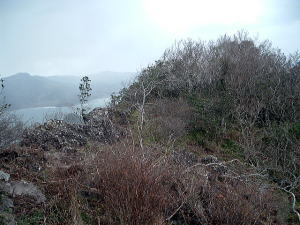 ![]() (左)志々伎湾の対岸に見える礫岩(拡大)。強烈に魅かれる (右)これから向かう北東稜 志々伎山に登る道は今回登った道1本だけだが、下りはそれを戻らずに、北東に延びる尾根をたどることにした。 国土地理院の地図には、尾根を直線距離で800mほど下ったあたりに、半島付け根の船越へ抜ける破線ルートが書かれている。そこへ出て船越まで志々伎半島を縦断しようと考えた。 頂稜を戻り、草履置場の上あたりから森に入って北東稜へと踏み出す。 こちら側は山頂の陰になって風があまり当たらない。岩場が多く、ぶら下がったり飛び降りたり、行きつ戻りつしながらじわじわ進んで行く。天狗かカモシカにでもなった気分。 ![]() (左)北東稜最初のピーク (右)やせた尾根筋 ![]() (左)イワヒバ、冬はこんなふうになるのを初めて知った (右)稜線の歩きやすい部分 尾根筋は歩きやすい部分もあるが、サルトリイバラなどに阻まれて迂回しなければならない場所も多く、なかなか進まない。踏み跡のように見えるところも現れるが、ほとんどはヤブ漕ぎだ。磁石で確認しながら主稜を外さないよう慎重に進む。 40分ほど経ったころ、ふいに小ピークにコンクリの標石を見つけた。たぶん地図にある215m地点だろう。 ![]() (左)小さな標石、大きな安心 (右)さらに下った場所から振り返る志々伎山。ここからは尖って見えない 問題はそこからだった。このあたりからは北側に何本もの細い尾根が派生しており、破線ルートに至る尾根の同定が難しい複雑な地形になっている。 1分おきに磁石と地図と地形を見比べながら慎重に進んでいると、明らかな踏み跡が現れた。喜び勇んで歩みを進めるうち、山腹を横切る、もっと明らかな踏み跡に出た。 山頂から1時間5分。これが地図の破線に違いない。 だが、じつはそうではなかった。 踏み跡を東へたどると、ルートは濃密なシダのヤブに阻まれた。そこを強引に押し通ると沼地に出た。沼地のヘリに石垣が見えるから、かつて水田が開かれた跡のようだ。 地図の破線は途中で谷を通過しているから、ここがその谷だろうと推測した。しかし、その先はトゲトゲのヤブで、どうあがいても進めない。破線ルートはすっかり廃道になってしまったのかな。 水田跡とおぼしき湿地石垣の上部には別の踏み跡がある。それをたどってみたが、山腹から尾根を巻いたところで濃密なシダヤブに閉ざされる。どう考えてもこれはおかしいぞ。 おまけにトゲだらけのヤブをくぐるうちに、いつしか地図とタオルが消えている。タオルはいいけど地図をなくすと万事休すだ。 必死で捜索して、なんとか地図は発見した。だが現在地は定かでなく、破線ルートへのアプローチも失われた。もはやこれまで、谷を下ってバス道へ出よう。飯田というあたりに出るはずだ。 谷を下る踏み跡は降りるほどにしっかりしてくる。調子に乗って飛ばしていたら、シダに隠れた倒木でスネを強打した。 ようやくバス道が見えたところでズボンをめくって見ると、スネの2ヵ所で白い肉が露出し、血がダラダラ流れている。小さな絆創膏を何枚か重ね張りして、バス道に出た。 時刻は12時15分、山頂から1時間40分だった。 地形から現在地を確認すると、飯田に出る谷ではなく、志々伎山北面の小谷群の東端の谷を下ってきたらしいことが判明した。破線ルートに到達する手前で、踏み跡に惑わされて別の尾根を下ってしまったようだ。 読図の難しさを改めて思い知らされた。 ![]() (左)バス道に出たあたりからの志々伎山、上向きの刃物を横から見た感じ (右)船越からの志々伎山 そのあとは、再び降りだした小雨の中、バス道を1時間ほど歩いて船越へ至り、さらに1時間以上かけて志々伎湾対岸の大志々伎町まで歩いた。(ここから礫岩方面への道を探ったが、よくわからなかった) 歩いたルート志々伎山はその特異な山体、立地の最果て感、厳しい気象条件、登山路に満ちる重厚な歴史、山頂の高度感と展望など、はるばる訪れた苦労を補って余りある名山だった。 少しずつ遠ざかるこの山を、何度も何度も振り返りながら後にした。 (登山日:06.12.28) →船越についてはこちら |