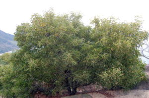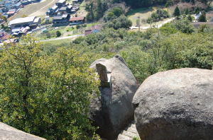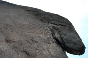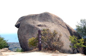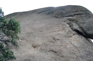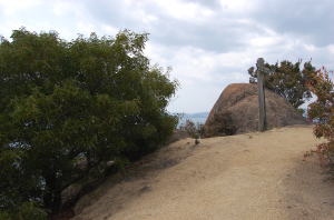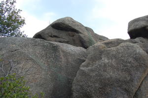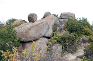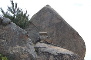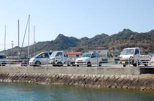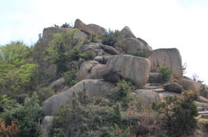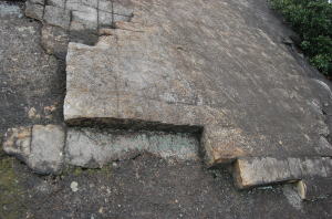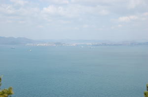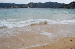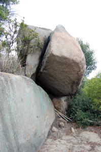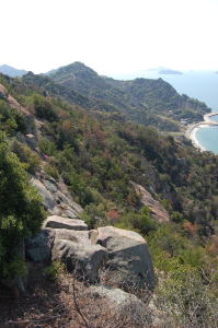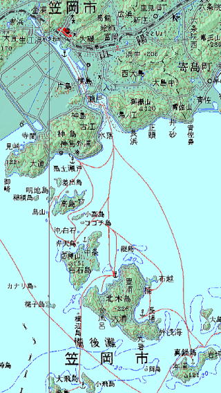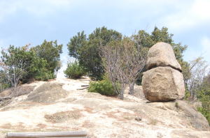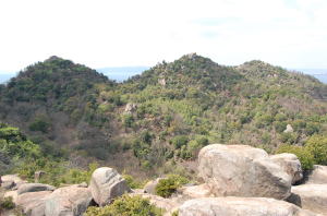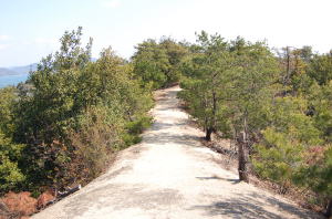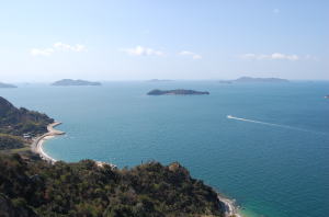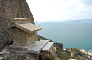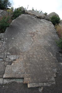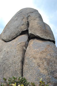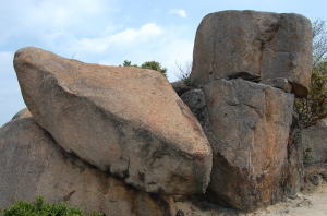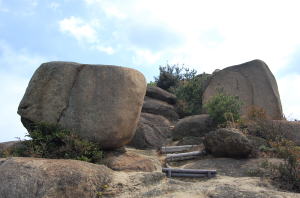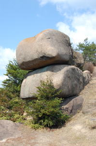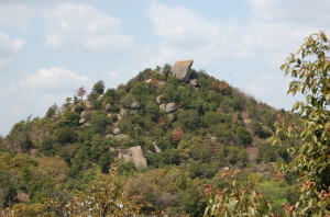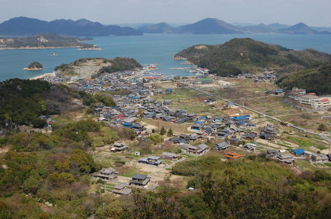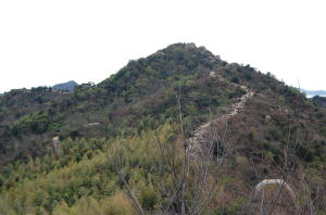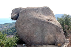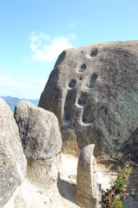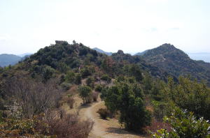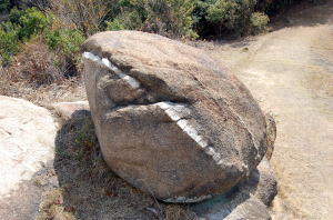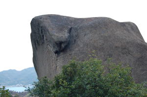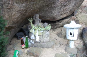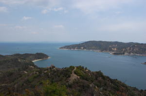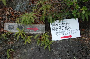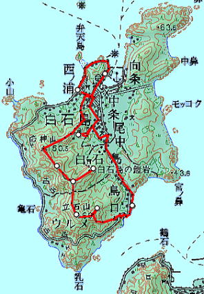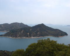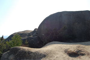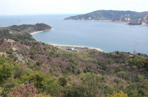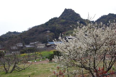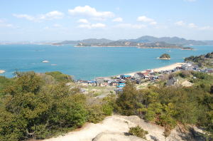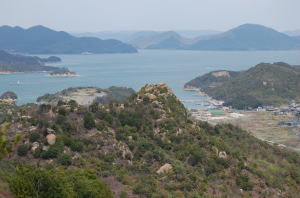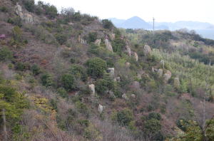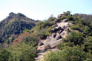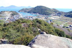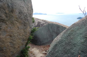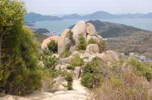 瀬戸内海は備讃瀬戸の西端、笠岡の沖合いの白石島というところに、天然記念物のふしぎな岩があるっちゅー話。 ということで笠岡港から高速艇に乗り込んだ。 ![]() (左)笠岡諸島 (右)白石島(赤線は歩いたルート) 20分ほどで白石島に到着。船のきっぷ売り場で島の案内パンフをもらった。 目の前に、島の西部を南北に連なるギザギザの山々が並んでいる。目的の鎧岩という岩は、主脈から東へ派生する尾根先端の「鬼ヶ城」と呼ばれる山の山頂部にあるらしい。岡山県の本土には鬼ノ城(きのじょう)という桃太郎伝説の山があるけど、ここも関係あんのかな? でも鬼ヶ城だけでなく主脈の山々も、山頂部にいちいち妙な石を乗せていたりしておもしろそう。だから、これを縦走しながら途中で鎧岩に立ち寄ることにした。 白石島の港から。左端のピークが鎧岩のある鬼ヶ城「国際交流ヴィラ」の看板を目印に、島内の狭い路地を抜けてゆく。素朴な島の風情がまったくもって素晴らしい。 西ノ浦の海水浴場へ抜ける峠に出たら、そこから尾根筋に道がついている。 ![]() (左)青い看板が目印 (右)素敵な路地 道は偽木階段でよく整備され、歩きやすい。六甲山と同様の風化した花崗岩の尾根道だ。 案内図によると、尾根筋の最初のポイントに「はと石(大)」とある。数分の登りで、それらしき大岩が見えてきた。 ![]() (左)あれが「はと石(大)」かな (右)振り返るとこんな道 ![]() (左)はと石(大)は高さ3m、幅4mほど (右)ステップが彫られている ![]() ![]() はと石(大)の上から、来た方角を見る。右の湾が港、左の砂浜が西ノ浦海水浴場 南側の下には石の上に石仏が乗っているこの石は、南の谷にある開龍寺の奥の院に位置づけられているようで、下の寺から直接登ってくるルートがある。その道沿いにミニ八十八カ所が設けられているようだ。はと石(小)もその途中にあるのかな? 行く手の山頂に、まっ平らな面をこちらに向けた変な岩が乗っている。案内図によると「大玉岩」。 ![]() (左)行く手は岩だらけ、そして左の山の頂に・・・ (右)なんじゃありゃ? ![]() (左)桜が咲き始めている (右)ヤマツツジも咲いている 尾根は広く快適で、木々もまだ葉を茂らせていないので、道全体が展望台状態だ。途中、開龍寺や海水浴場へ下る道が右に左に分岐する。 ゆっくり登って、登り口から30分ほどで高山展望台(150m)に到着した。国土地理院の地図では応神山となっている。 ここで一気に西側の海が視界に飛び込んで、360度の展望が広がった。 ![]() (左)島々を抜けてゆく船 (右)北西に福山の工業地帯が見える ![]() (左)これから進む道。左側のピークに大玉岩 (右)西側斜面は切り立った崖になっている 南は、この先の道が一望のもとだ。よく整備されているようで、まるで万里の長城のように尾根にくっきりと続いている。 ここから岩がゴロゴロした尾根をいったん下り、登りなおして10分かからずに大玉岩のピークに着いた。 ![]() (左)途中にあった、地層の浮き出た岩 (右)積んだような岩 ![]() (左)出ました大玉岩、でも平たくないが・・・ (右)鼻みたいなのがついてるぞ ![]() (左)おっと、こっちの面がまっ平だ (右)平らな面を見上げる ![]() (左)この鼻が気になる (右)大玉岩の下の神様 大玉岩の横の岩でのんびりとパンを食い、寝ころんで日光浴をしていたら、ちょっと寝てしまった。風はひんやりしているが春の日差しは暖かくて、ぽっかりこぽっかりこだ。 幸せにひたりながら30分以上だらだらした。 いったん下って、次のピークは東側を巻いて通過する。尾根筋はずっと展望台状態だったが、この巻き道部分だけが樹林の中になる。 少し離れて見ると、巻いたピークの山頂には切れ目を入れたトーフみたいなおもしろい岩が乗っている。案内パンフの地図には「なべかろう」と書かれている。意味はわからん。 なべかろう付近から大玉岩を振り返るその次のピークは、鎧岩のある鬼ヶ城へと続く支尾根の分岐点になっている。このあたり、植栽された桜のつぼみがすずなりに膨らんで開花寸前。あと1週間ほどしたら一面の桜山になるだろう。 それを5分も歩くと、鬼ヶ城の山頂付近に到達した。 ![]() (左)鬼ヶ城山頂、岩だらけ (右)この岩の上だ ![]() 鬼ヶ城から見下ろす港と集落 山頂の岩の上も当然のごとく360度展望だ。 白石島の中心集落と港とが箱庭のように見える。南には白石島最高峰の立石山と、その脇に隣の北木島が見えている。西にはここまで歩いて来た主脈が並んでいる。 ![]() (左)右から高山展望台、大玉石、なべかろう、の各ピーク (右)鎧岩を示す標識 ところで国の天然記念物という鎧岩はどこにあるんだろう。 麓へ続く道を少し下ったところに「鎧岩→」の標識があり、こんな岩壁が現れた。 ![]() (左)鎧岩 (右)碁盤目のように四角く割れてはがれている 高さ8〜10mくらいだろうか。花崗岩を貫いて噴出したアプライト岩脈で、垂直の花崗岩の表面に15cmくらいの厚みで貼り付いている。これが鎧に似てるというわけだが、たしかにきっち
